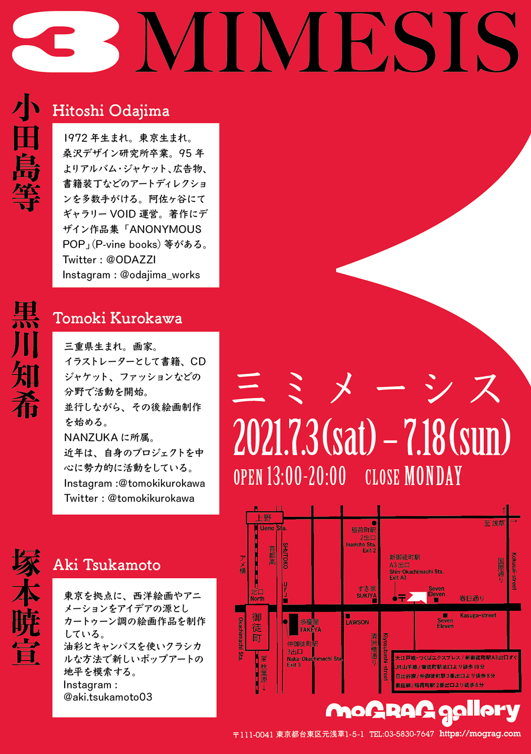 3名の美術家・小田島 等、黒川知希、塚本暁宣が、3人展「3MIMESIS」を東京・新御徒町 mograg galleryにて7月3日(土)から7月18日(日)まで開催。マーチャンダイズも販売されます。