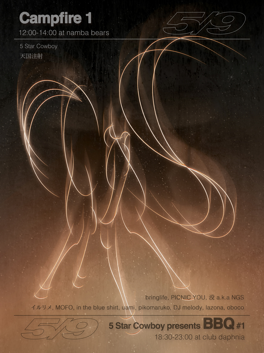昨年末に東京・下北沢 SPREADにて行われたリリース・ショウが盛況となった5 Star Cowboy。大阪は昼夜2公演。リリース・ライヴに位置付けられたBEARS公演「Campfire 1」(12:00~14:00)は天国注射との2マン・ショウ。18:30~23:00のclub daphnia公演「5 Star Cowboy presents BBQ #1」にはイルリメ、in the blue shirt、lazona、DJ melody(yaci)、MOFO、oboco、pikomaruko、uamiの出演が決定しています。両公演の参加者には“ハシゴ割”が適用され、「BBQ #1」に1,000円引きで入場可能。
