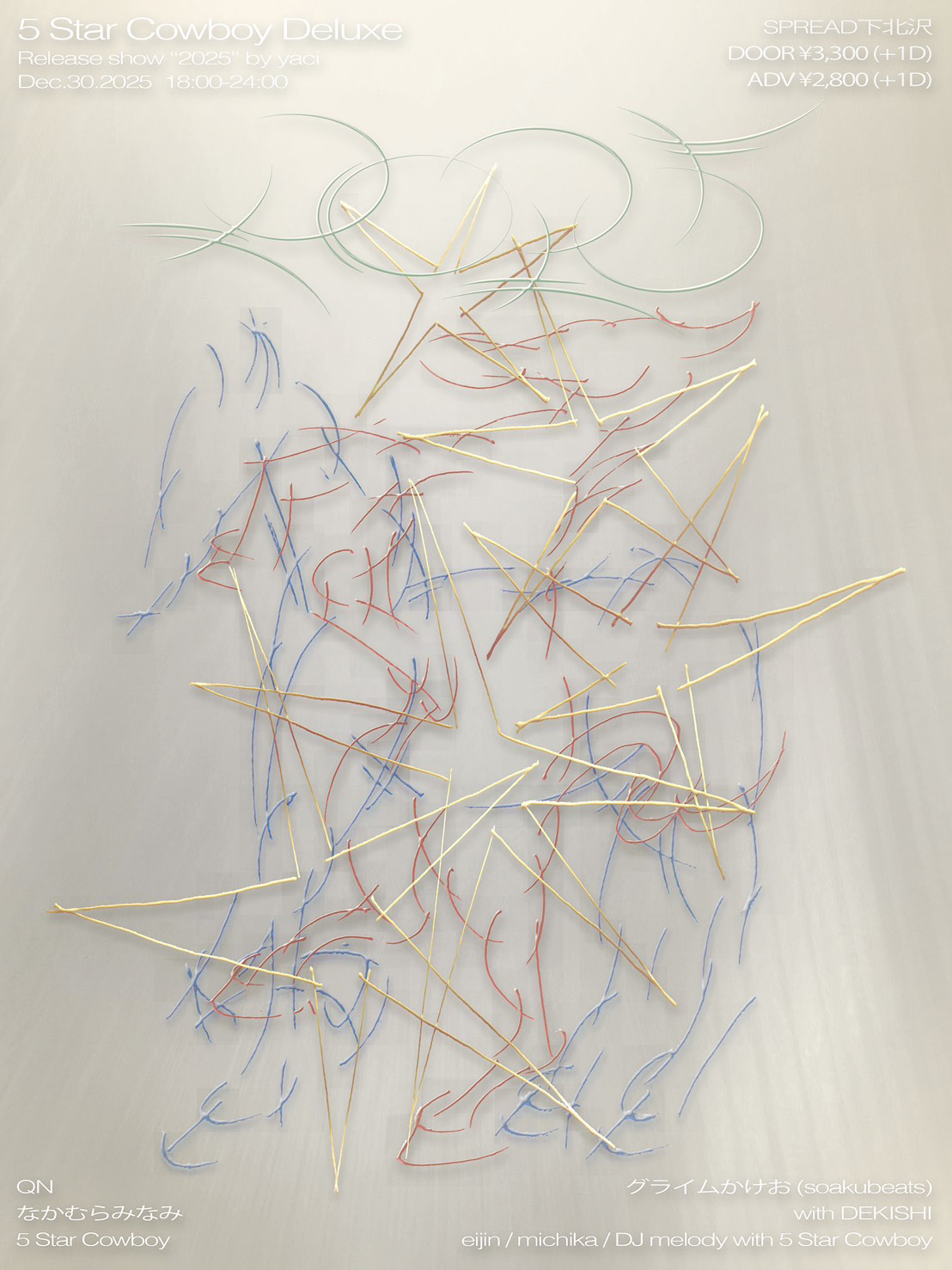 また12月30日(火)には、同作のリリース・ショウ「2025」を東京・下北沢 SPREADにて出版レーベル「yaci」による企画で開催。同公演では、5 Star Cowboyに加えてアルバムに参加したDEKISHI、なかむらみなみ、QNがライヴ・パフォーマンスを行うほか、DJとしてeijin、グライムかけお aka soakubeats、DJ melody、michikaが出演。「yaci」がデコレートする会場内では、INOUEが5 Star Cowboyメンバーのために制作したエクスクルーシヴTシャツをオフィシャル・マーチャンダイズとして販売。「yaci」が制作したブート・アイテムの販売も予定されています。