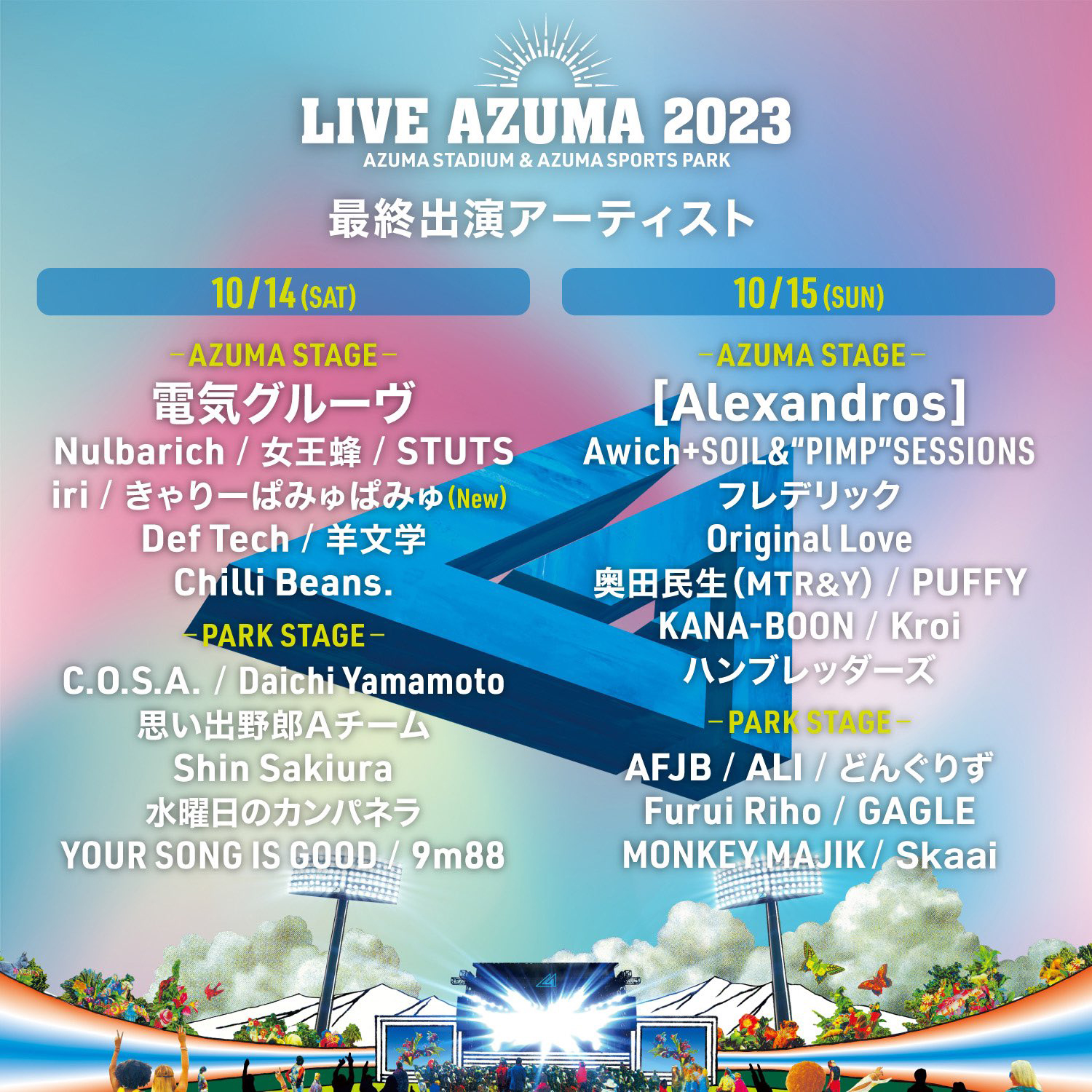 昨年に続いて2度目の開催となる同イベントは、スタジアム周辺で開催される入場無料のマーケット「PARK LIFE」と連動した県内最大級のフェスティヴァル。14日は9m88のほか、、Chilli Beans.、C.O.S.A.、Daichi Yamamoto、Def Tech、電気グルーヴ、フレデリック、iri、女王蜂、きゃりーぱみゅぱみゅ、思い出野郎Aチーム、羊文学、Nulbarich、Shin Sakiura、STUTS、水曜日のカンパネラ、YOUR SONG IS GOODらが出演。15日は、AFJB、[Alexandros]、ALI、Awich + SOIL & "PIMP" SESSIONS、どんぐりず、GAGLE、Furui Riho、ハンブレッダーズ、Kroi、MONKEY MAJIK、奥田民生(MTR&Y)、Original Love、PUFFY、Skaai、らが出演します。