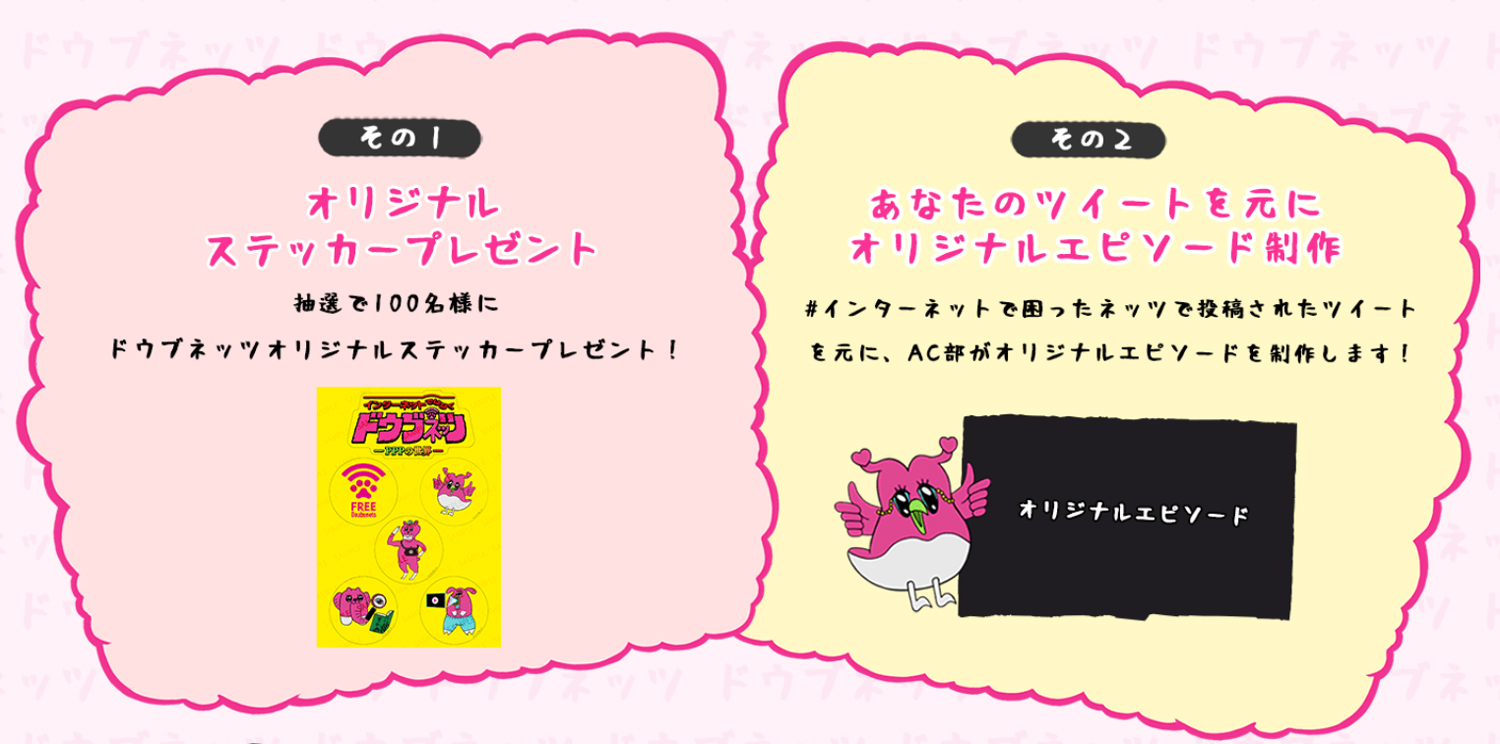 また、ユーザーがハッシュタグ「#インターネットで困ったネッツ」をつけてツイートするキャンペーンを同時開催。オリジナル・ステッカーのプレゼントのほか、投稿された内容を元にAC部がオリジナルエピソードを制作予定。