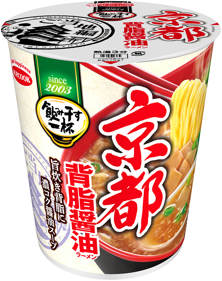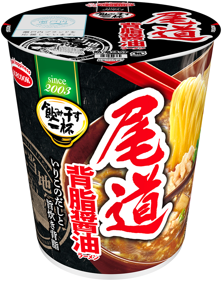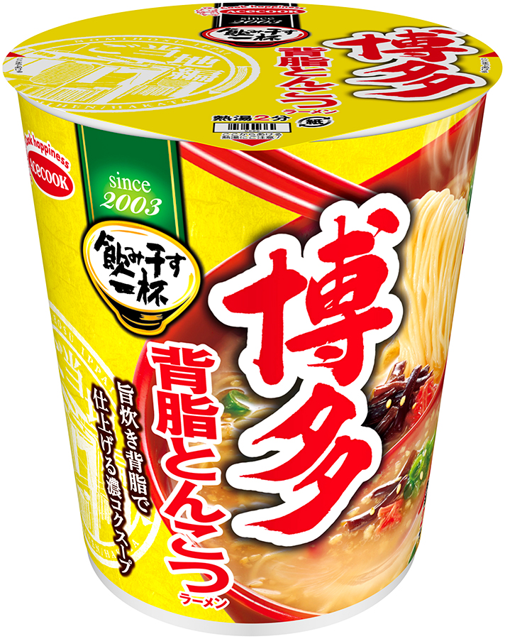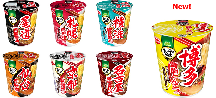 『タテ型 飲み干す一杯 尾道 背脂醤油ラーメン』『タテ型 飲み干す一杯 札幌 海老味噌ラーメン』『タテ型 飲み干す一杯 横浜 豚骨醤油ラーメン』『タテ型 飲み干す一杯 仙台 辛味噌ラーメン』『タテ型 飲み干す一杯 京都 背脂醤油ラーメン』『タテ型 飲み干す一杯 名古屋 味噌煮込みうどん』の6種に加え、リニューアルにあたって『タテ型 飲み干す一杯 博多 背脂とんこつラーメン』が仲間入り。背脂のコクと旨みが効いたスープと細硬麺で、博多の味が楽しめます。