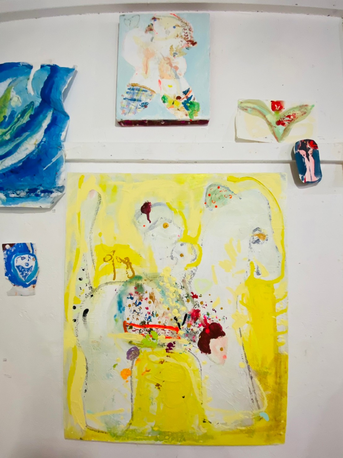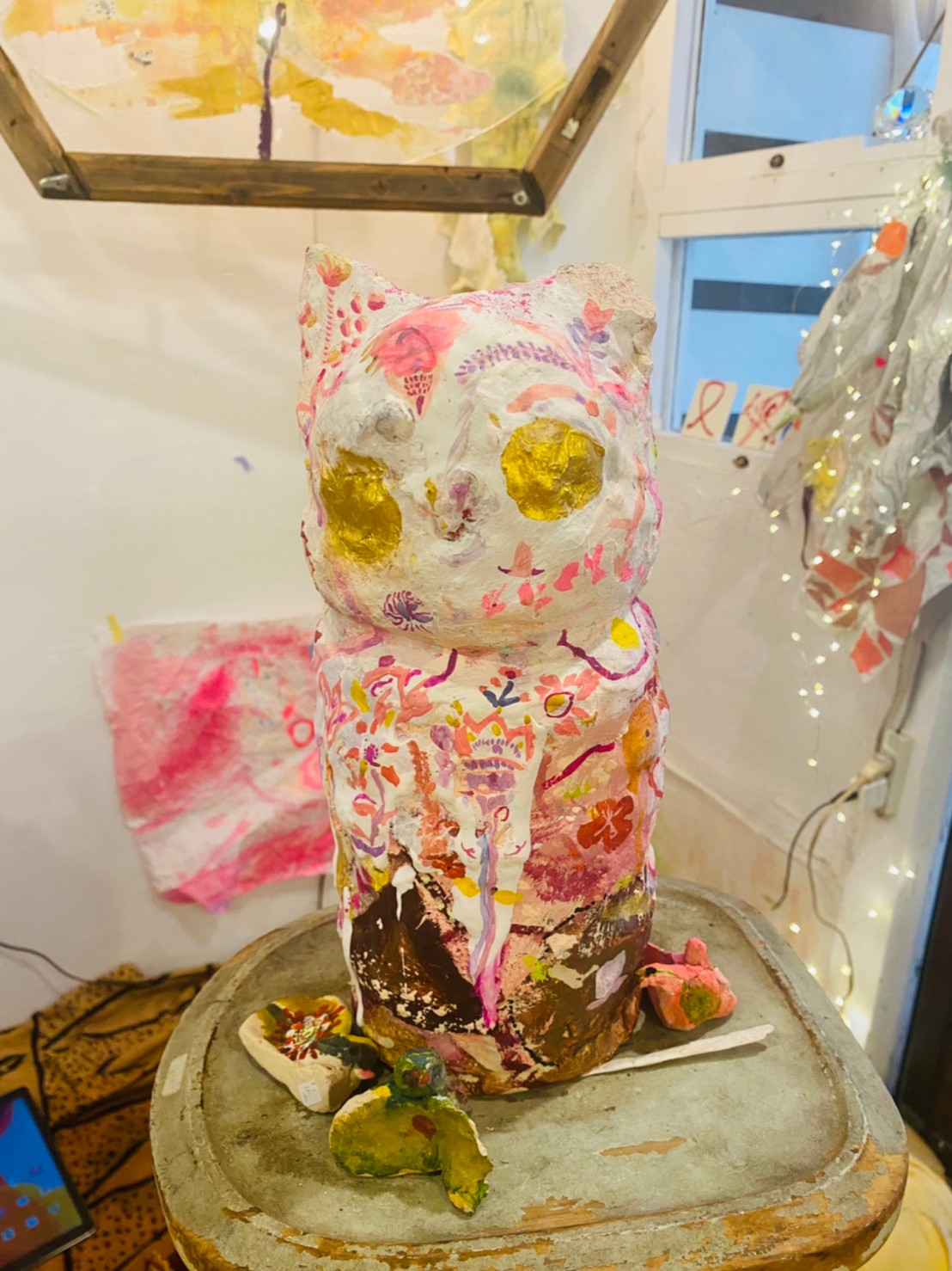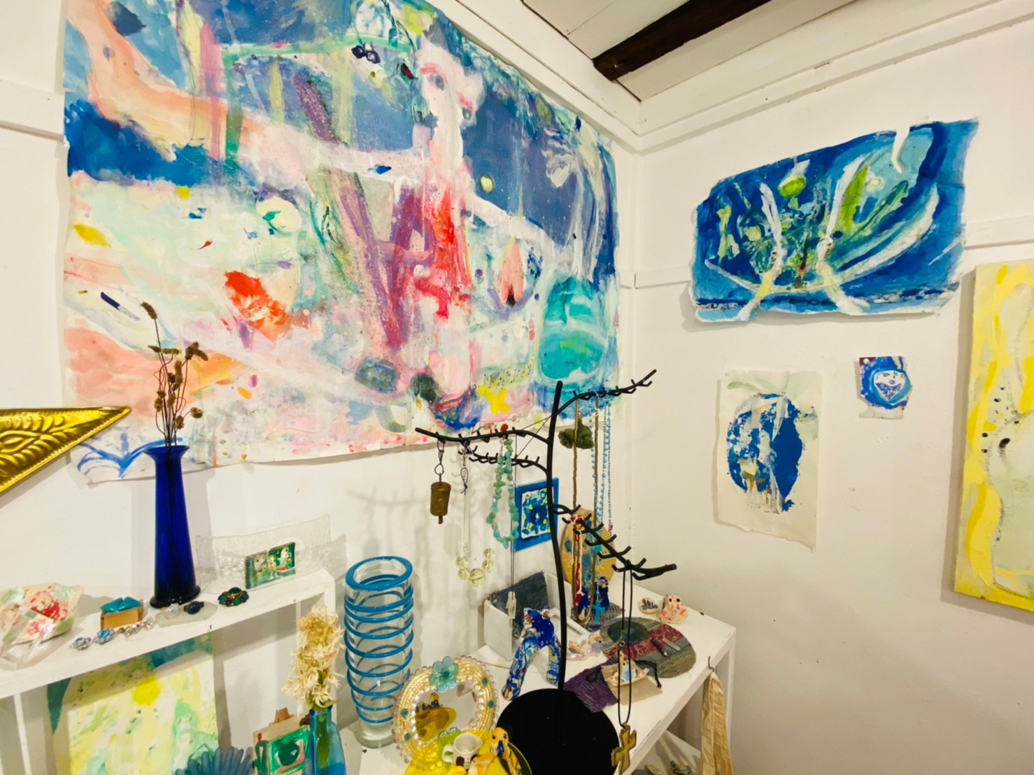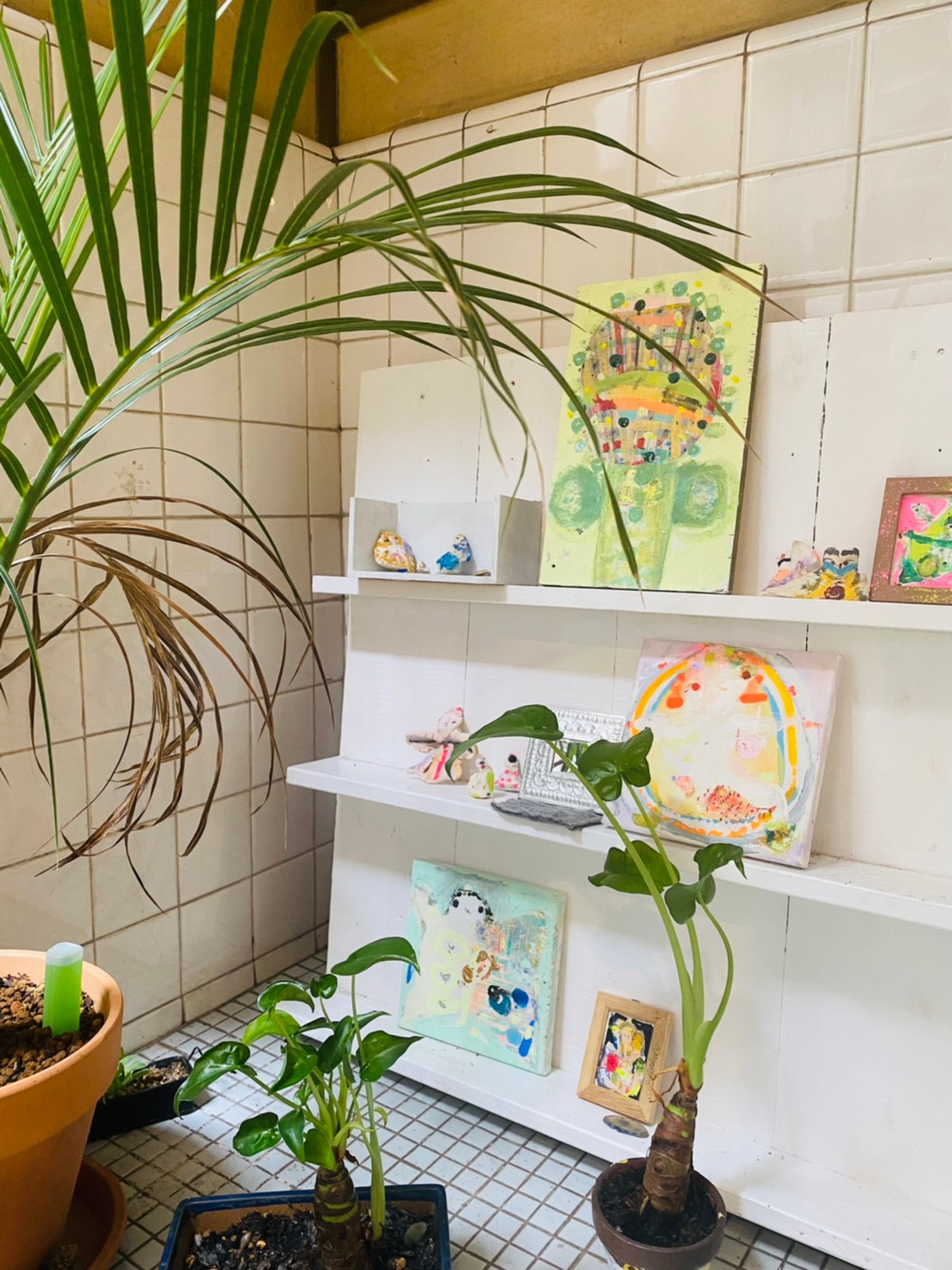 骨董や貝殻の間に、ちょこんと置かれた陶器の作品も桜子ちゃんが作ったもの。握り拳で粘土をぎゅっと潰しただけのような置物が大きなパワーを放出していて、目が合ってしまう。桜子ちゃんの作品は昔から生命力の塊だけど、近年は大きい愛も感じて、触れていると自然と優しい気持ちになるものが多い。そんな絵画たちに囲まれた店内はほっと安心できるし、あたたかい気持ちに包まれる。