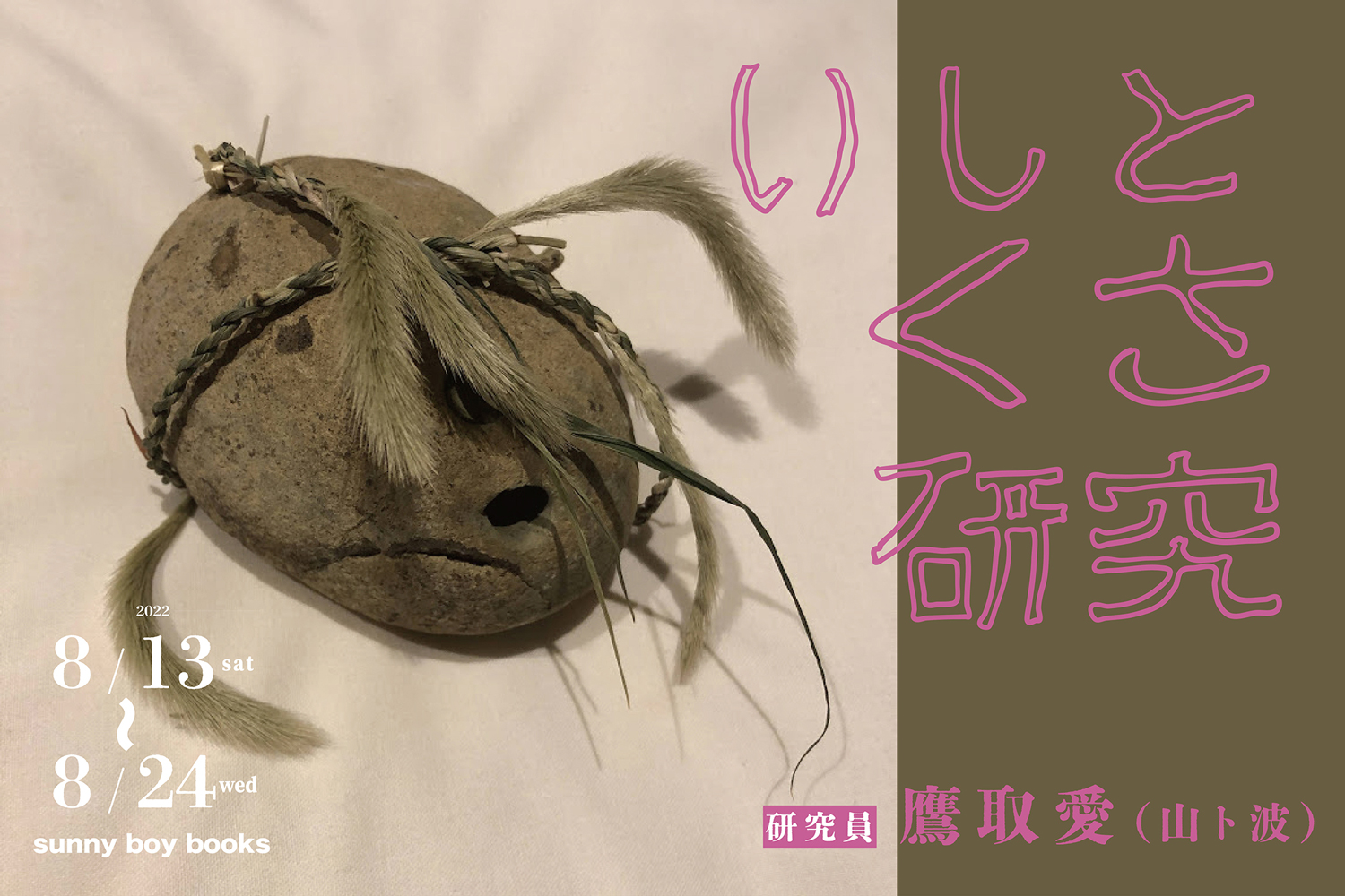 同展では、SUNNY BOY BOOKSの展示企画サポート要員でもある鷹取が、“研究員”となって石と草について“自由研究”した成果を発表。石と草を合わせた「お守り」や、縄ない(縄作り)についての研究などを展示販売します。