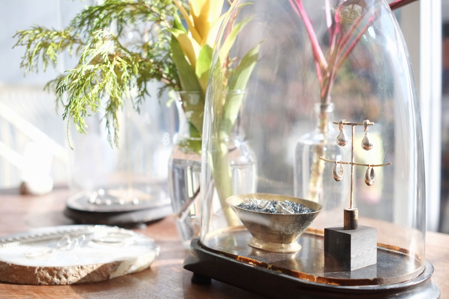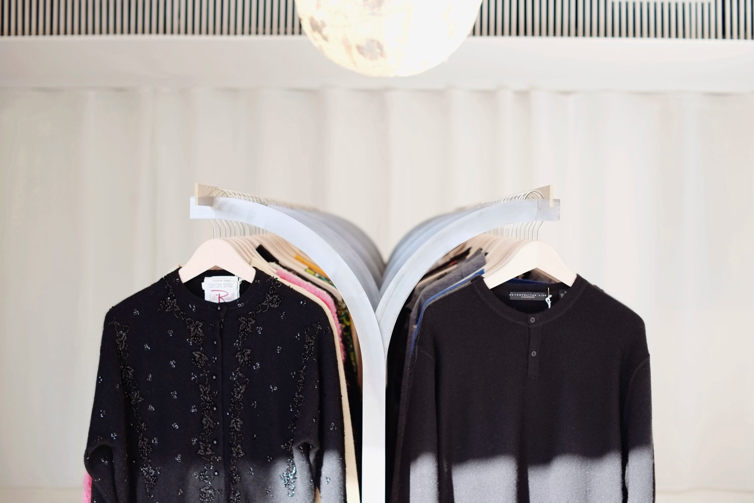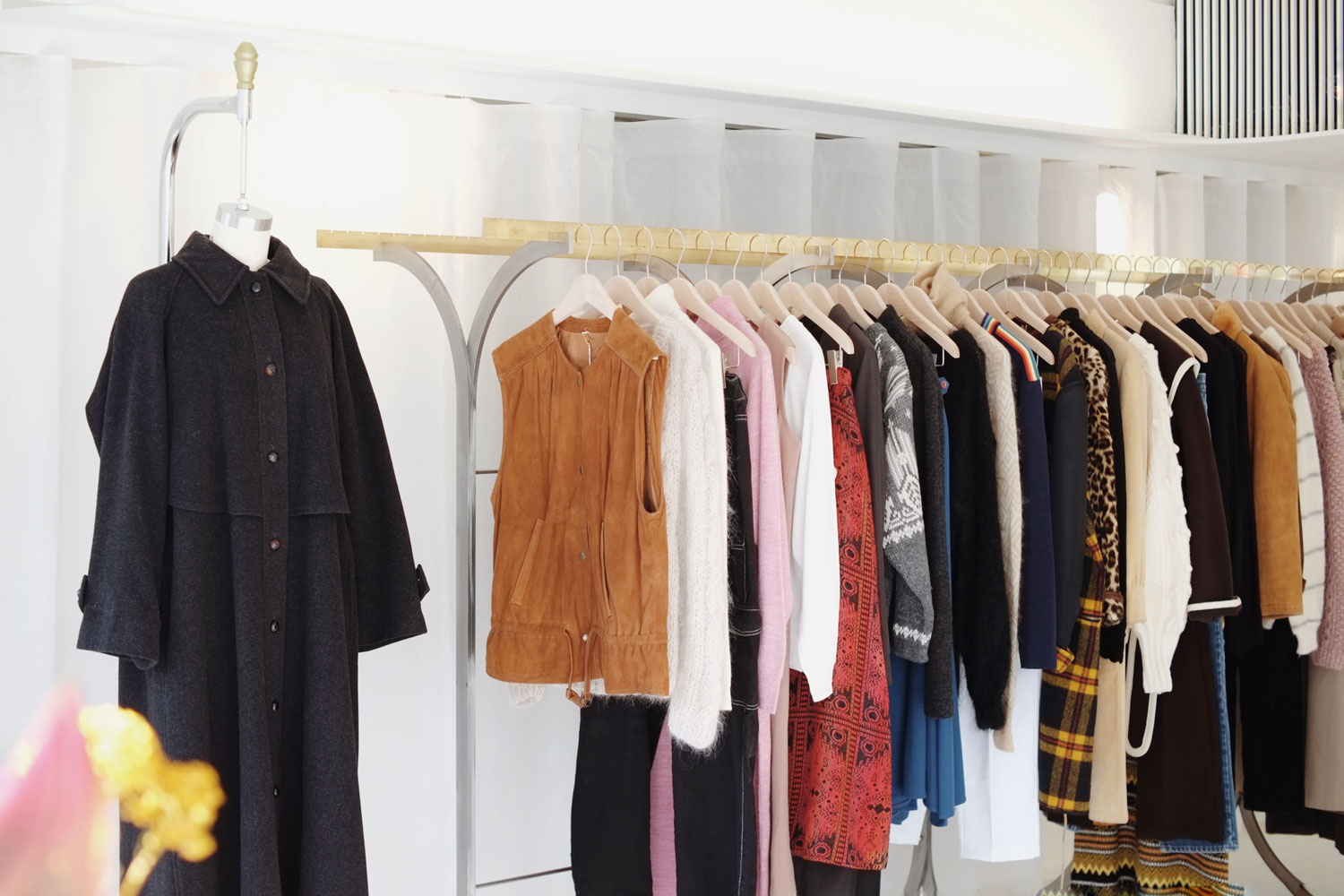 花ちゃんは、実店舗を2021年5月にオープンした。24歳のとき。小田急線の梅ヶ丘駅から徒歩30秒、全面ガラス張りの広々とした2Fの店舗。一見ショウルームみたいに整った店内で、Uの形で覆う長いオーガンジーのカーテンが壁面に揺れている美しい空間。彫金のオリジナル・ハンガーラックに、真ん中には建築家さんがプレゼントしてくれた大きな丸い押し花の照明がある。格別にかっこいい……!そこにお行儀よく洋服たちが並んでいる。端から端までじっくりと洋服をめくりながら、細部までかっこよくて、潔くて、こんなに古着って楽しいんだと、花ちゃんが選ぶ古着で初めて気づいたかもしれない。古着だけど“お”を付けたくなる特別な“お洋服”。古着って世界でたったひとつの、特別な出会いの感じがあるから嬉しくて、なんだか自分がこの古着に選ばれたような気分になった。
