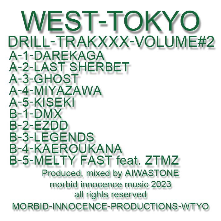 “日本の曲のサンプリングのみで構築されるDRILL BEAT”がテーマのAIWASTONEは、国産塩ビ盤の扱いに定評あるAIWABEATZのソース・セレクトと、早くからドリル・トラックの制作に着手し、西東京スタイルへと昇華させたIRONSTONEのビートワークにより、ドリルのパブリック・イメージをシフトさせる特異な音楽性を実現。ZTMZフィーチャー曲を含む『West Tokyo Drill Trakxxx Vol.2』も、フレッシュな異色ドリル作品としてのみならず、アーリー・ダブステップ期におけるGuido、Oriol、SEPALCUREなどのファンにもアピールするであろう間口の広さも併せ持つ内容となっています。