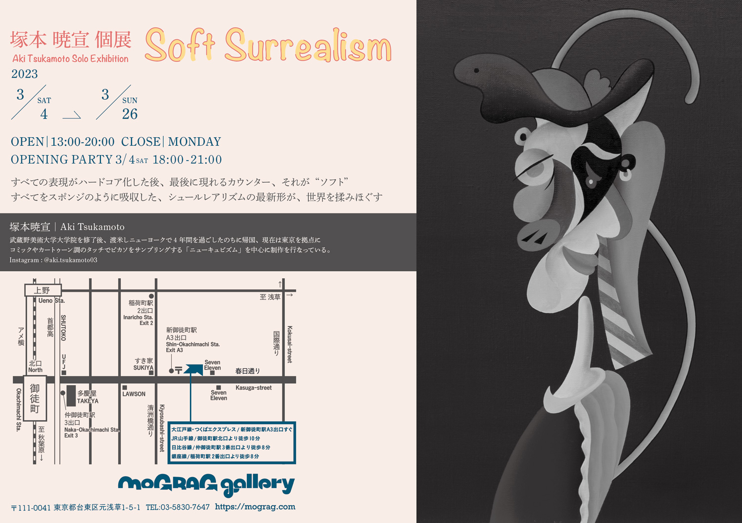 昨年は東京・阿佐ヶ谷 VOID」、両国 LIGHT HOUSE GALLERY、渋谷 elephant STUDIOでの個展や中村桃子との二人展「A Walk in the Park」が好評を博した塚本暁宣が、ソロ・エキシビション「Soft Surrealism」を東京・新御徒町 mograg galleryにて3月4日(土)から26日(日)まで開催。