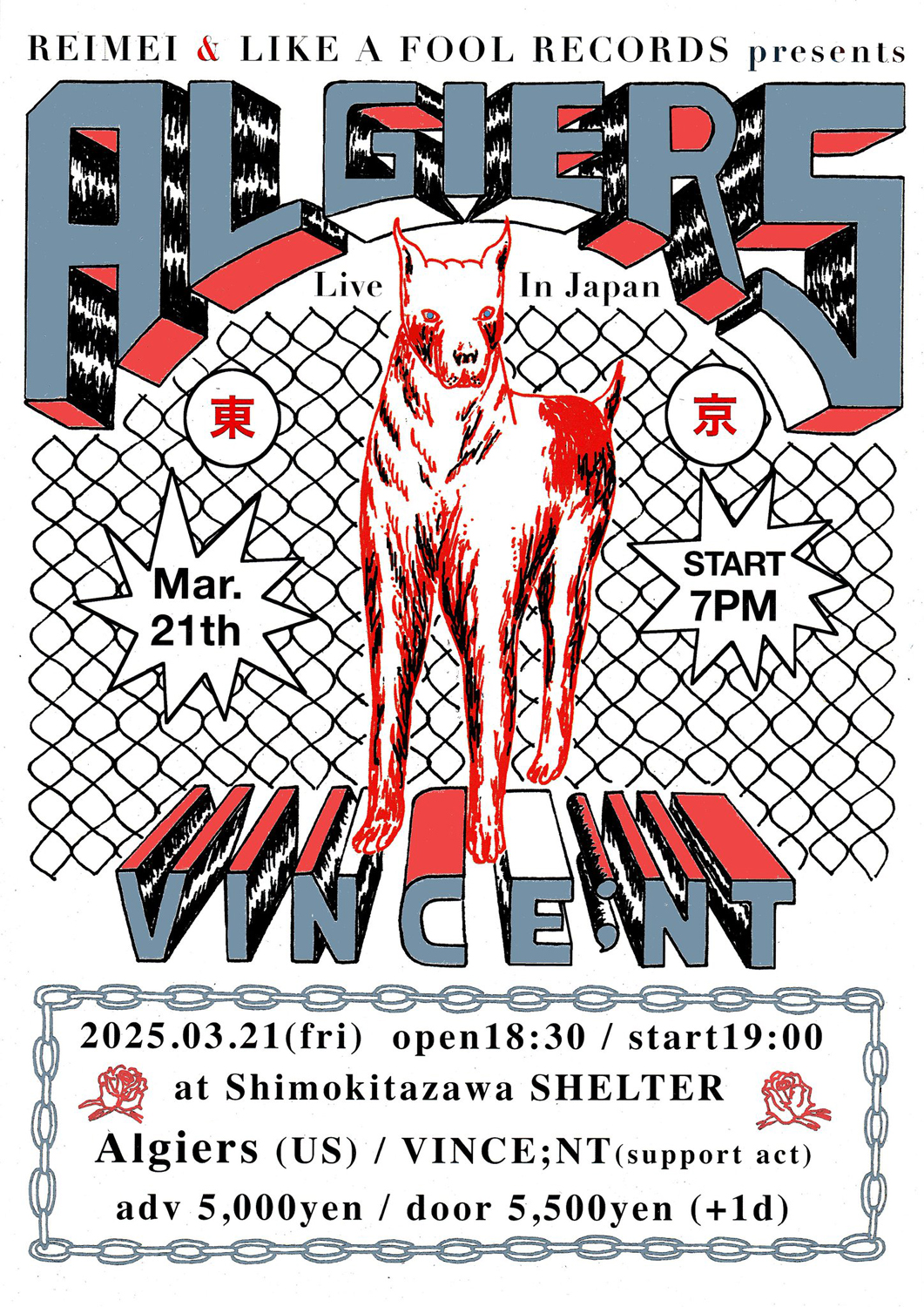 ポストパンク、ノーウェイヴ、ノイズ / インダストリアル、フリージャズ、ヒップホップ、ダブ、ソウル / ゴスペル、アフロ・フォークロア、サザン・ゴシックなどの要素がモダンな洗練を経て混交する音楽性で注目を浴び、東 信(東信, 花樹研究所)、Brendan Canty(FUGAZI)、MASSIVE ATTACKらとの音楽のみに留まらないコラボレーションや、Adrian Sherwood、故・Mark Stewartらをフィーチャーした別動隊・NUN GUNでの活動も好評を博しているALGIERS。本公演は、東京・調布「Studio REIMEI」と、レーベルとしても精力的に活動する東京・新代田のレコード・ショップ「LIKE A FOOL RECORDS」の共催で実現するもの。オープニング・アクトとして、「Studio REIMEI」ファウンダー・新間雄介(SAGOSAID)が在籍するVINC;ENTの出演が決定しています。フライヤー・アートは、個展「LOST CONTROL」(東京・神保町 stacks bookstore)を終えたばかりのKTYLによるもの。