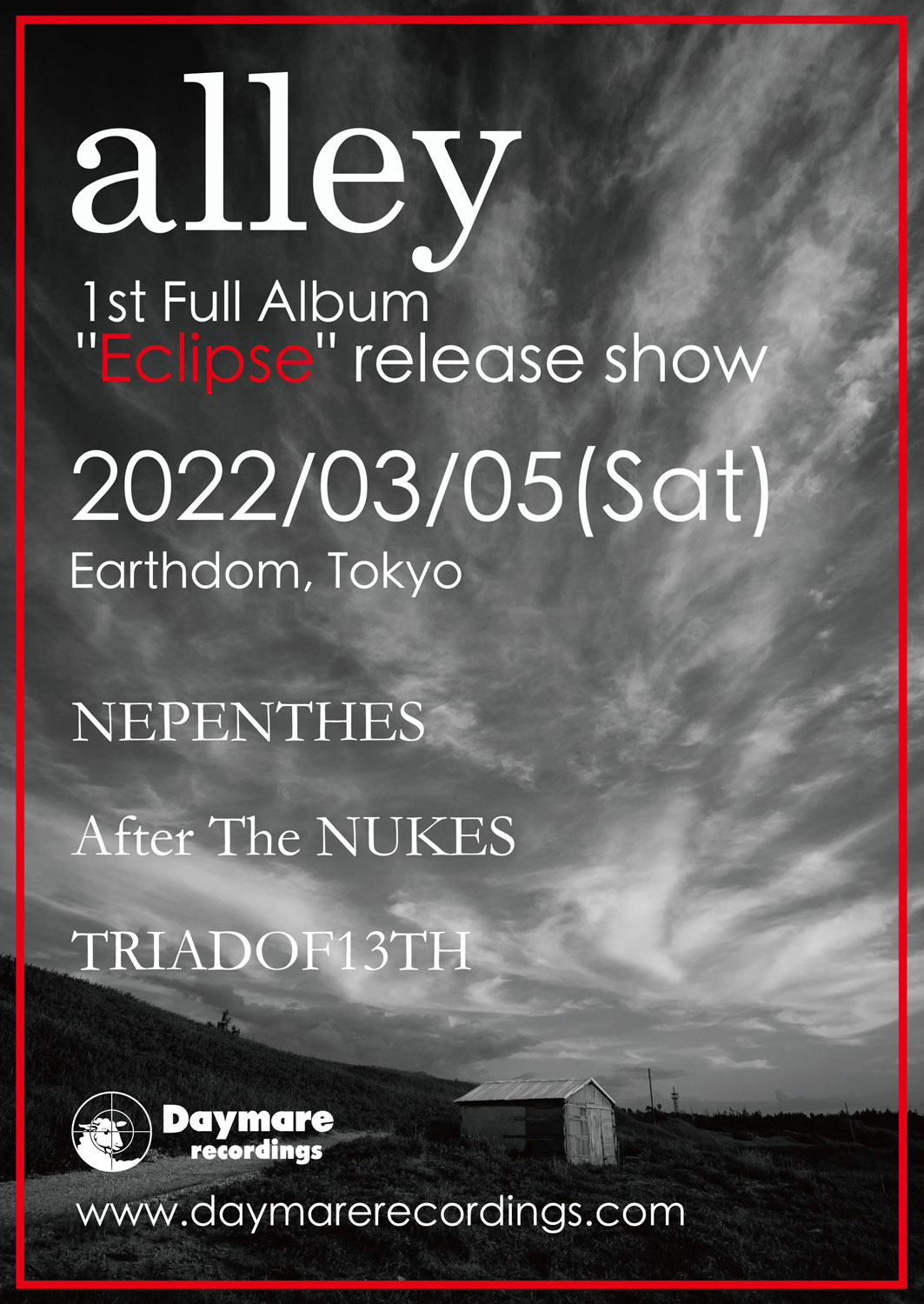 東京では、昨年末に小岩 BUSHBASHで開催されたライヴ・イベント「everything must go VOL.17」への出演以来のパフォーマンスとなる同公演。alleyに加え、NUKEY PIKES + SUPER DUMBの元メンバーによる話題のバンド・After The NUKES、東京ドランクン・ヘヴィロック・オールスターズNEPENTHES、昨年のフル・アルバム『曲がり角 ニオイ 夢の夜』が好評のTRIADOF13THが出演します。