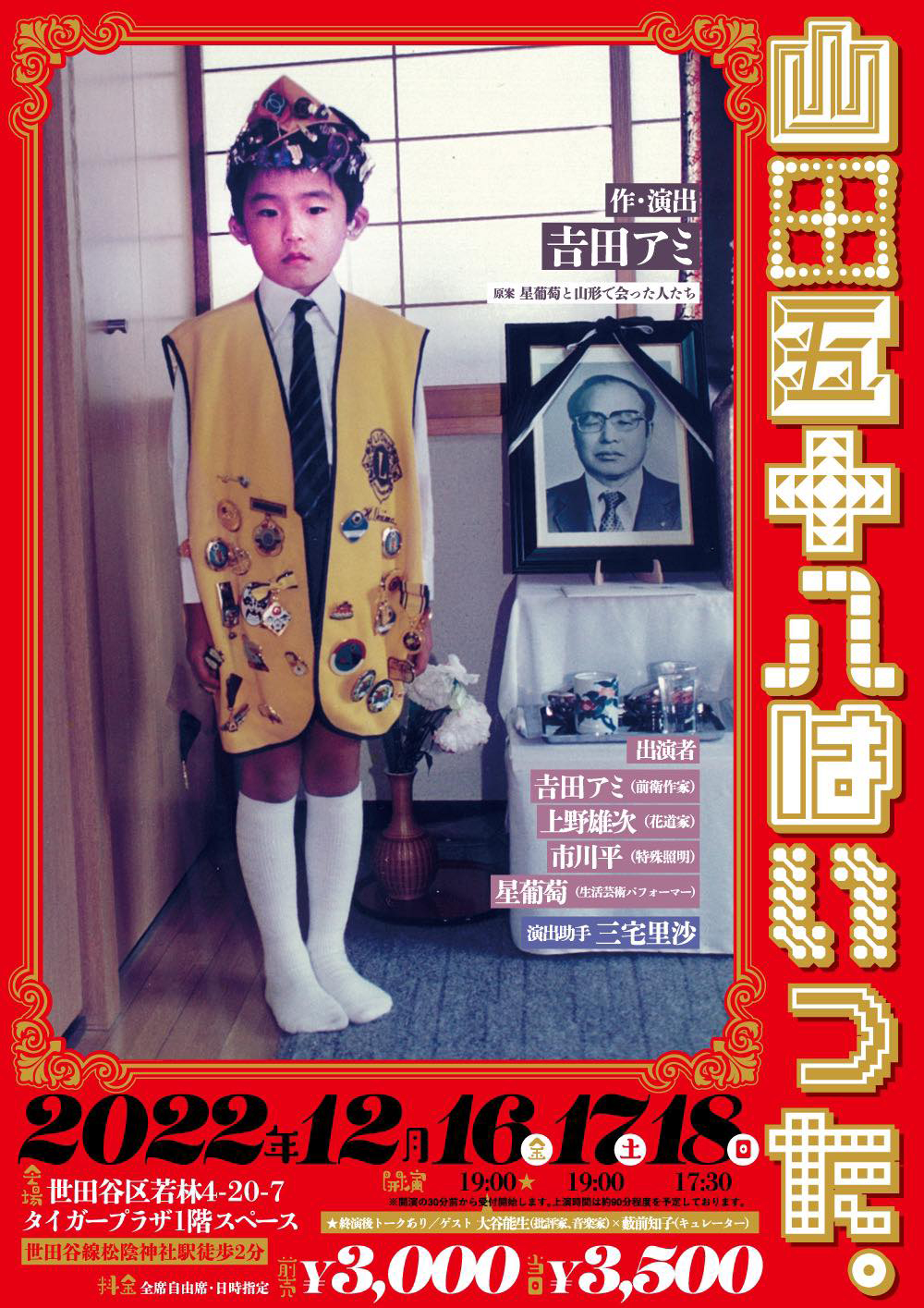 今年はスモール・プレス / レーベル「虎鶫」を設立し、ぷり aka 星 葡萄著『酒場のぷりンス』、清水みさと著『サウナのぷりンセス』の刊行が話題となっている𠮷田アミが、舞台作品「山田五十八はいった。」を12月16日(金)から18(日)までの3日間、東京・松陰神社前 タイガープラザ 1Fスペースにて上演。封切りに先駆けてhitachtronicsがデザインしたフライヤー・アートが公開されています。