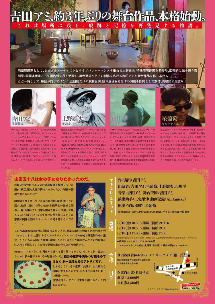 『酒場のぷりンス』を原案として今年9月に山形・鳥居ヶ丘のオルタネイティヴ・スペース「へそ(heso)」にて𠮷田が行ったアーティスト・イン・レジデンスの期間中、現地で出会った人々および物体、付随する記憶の集積を基に制作されたという同公演は、連日を非可逆的に用い、反復 / 再現としての演劇のデコンストラクションを即興的に試みる作品とのこと。出演は𠮷田のほか、上野雄次(花道家)、市川 平(特殊照明)、星 葡萄(生活芸術パフォーマー)の4名。演出助手は三宅里沙が担当しています。
