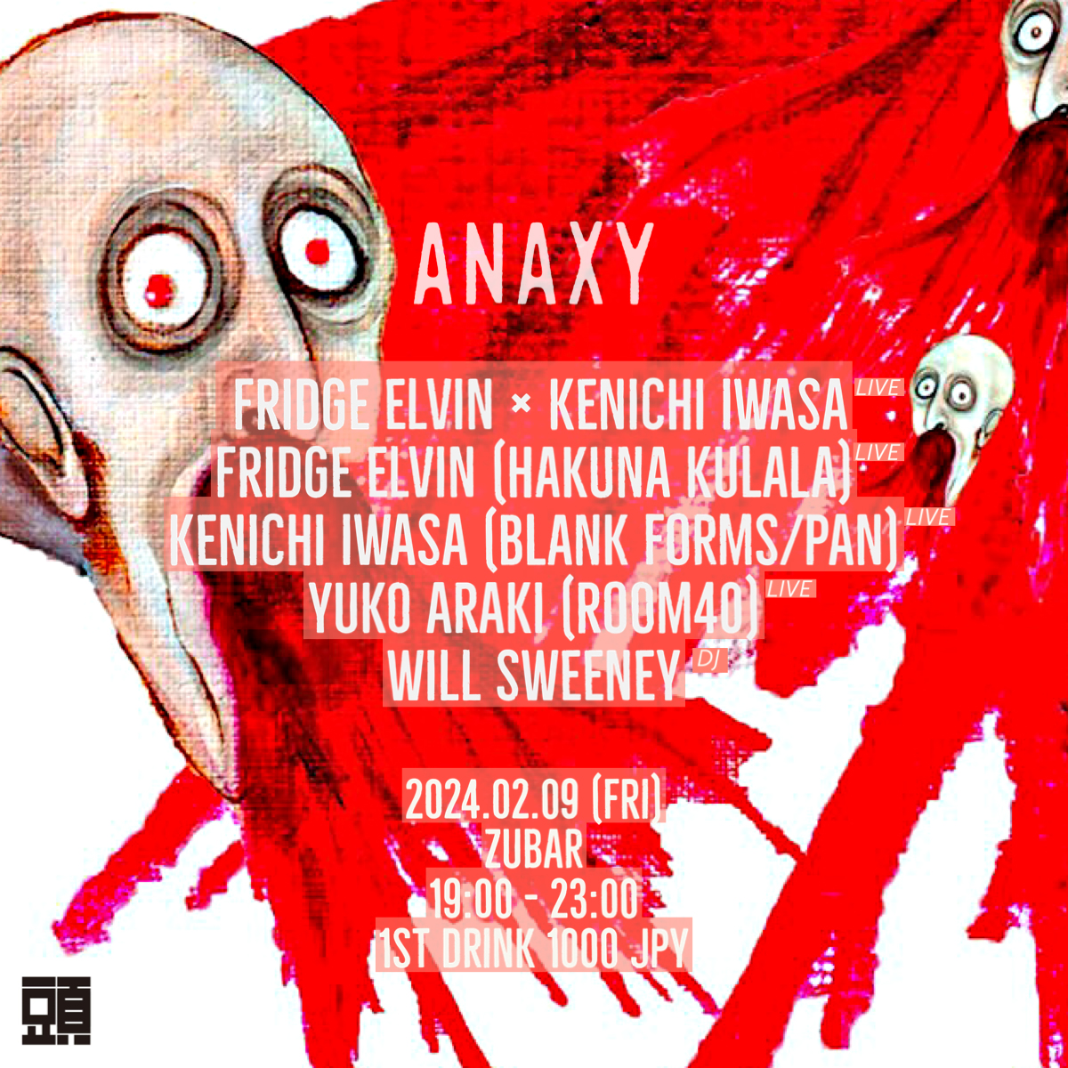 AVRIL SPLEEN、INSIN、YEAH YOUの一員として「Alter」「Opal Tapes」などから作品を発表し、ソロでもVillaelvin名義で「Hakuna Kulala | Nyege Nyege Tapes」よりフル・アルバムを発表しているFridge Elvinと、Yuki Tsujii(BO NINGEN)とのXAVIERSでも活動し、ロンドンの名物イベント「Krautrock Karaoke」の主催者としても知られるKenichi Iwasaが、英国より来日。昨年末に「Room40」よりフル・アルバム『IV』をリリースしたばかりのYuko Arakiと共にライヴ・イベント「ANAXY」を2⽉9⽇(金)に東京・渋谷 頭バー ZUBARにて開催します。