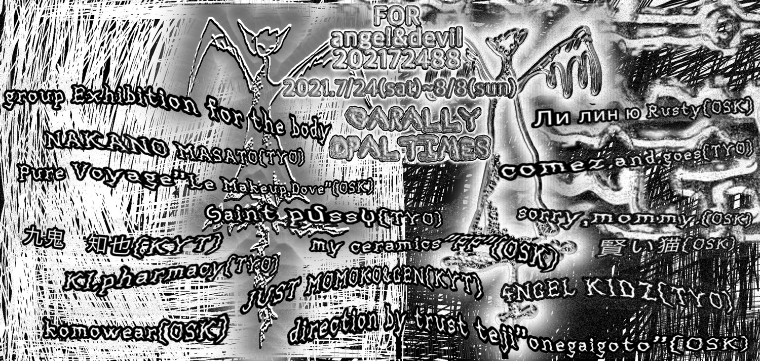 アパレル・ブランド「onegaigoto」のデザイナーでもあるタトゥ・アーティスト“trust teji”がディレクションの同展には、trust tejiのほかsorry, mommy.、賢い猫、KI.pharmacy、Ли лин ю Rusty、Pure Voyage(Le Makeup + Dove)、4NGEL KIDZ aka Hikam (tamanaramen)、ナカノマサト、JUST MOMOKO & GEN、ꚸaint pմss𐬬、comez.and.goes、my ceramics(FF)、komowear、九鬼知也が参加。“天使と悪魔のために”をテーマに、アパレルや身体を装飾するアイテムを中心とした展示販売が予定されています。