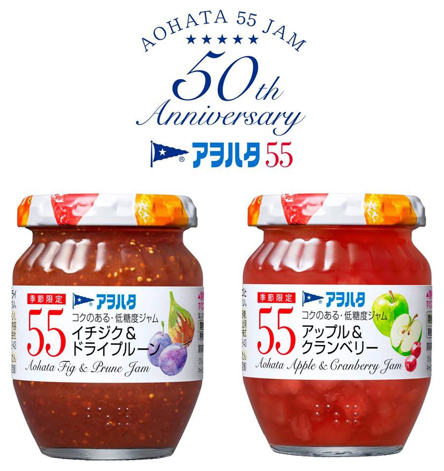 1970年の販売開始から今年で50年目を迎えた「アヲハタ株式会社」のジャム・ブランド「55ジャム」が、期間限定ジャム2品『55 イチジク & ドライプルーン』(150g | 232円 + 税)と『55 アップル & クランベリー』(150g | 232円)を発売。8月18日(火)より出荷が開始されます。