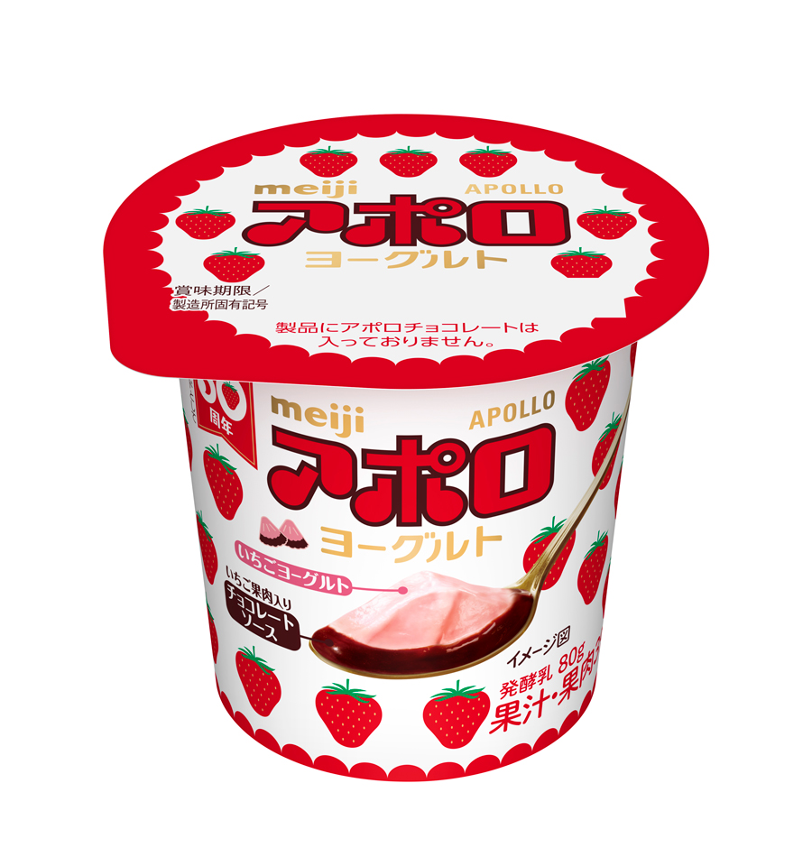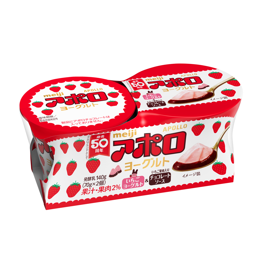 ロングセラー小粒チョコレート『アポロ』(株式会社明治)の生誕50周年を記念し、その味わいを忠実に表現した2層タイプのヨーグルト『アポロヨーグルト』が発売決定。1月27日(月)より2個タイプ(70g × 2個 210円 + 税)、2月4日(火)より1個タイプ(80g × 1個 140円 + 税)が各々期間限定で販売されます。