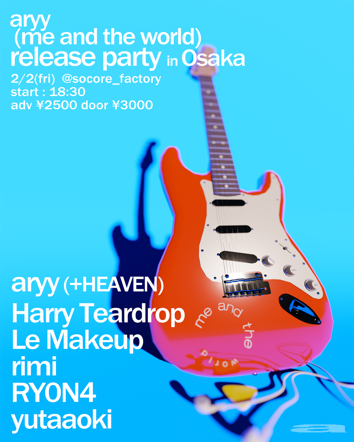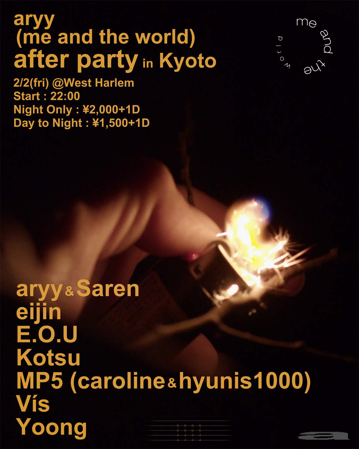 また、2月2日(金)には大阪・南堀江 SOCORE FACTORYにて『me and the world』のリリース・パーティを開催。aryyに加え、HEAVENの盟友・RY0N4、米NYを拠点に活動するHarrison Li aka Harry Teardropや、Le Makeup、rimi、yutaaokiが出演。同日ナイトタイムに京都・木屋町 West Harlemにて開催されるアフター・パーティには、aryy & Saren、eijin、E.O.U、Kotsu、MP5 (caroline + hyunis1000)、Vís、Yoongの出演が決定しています。