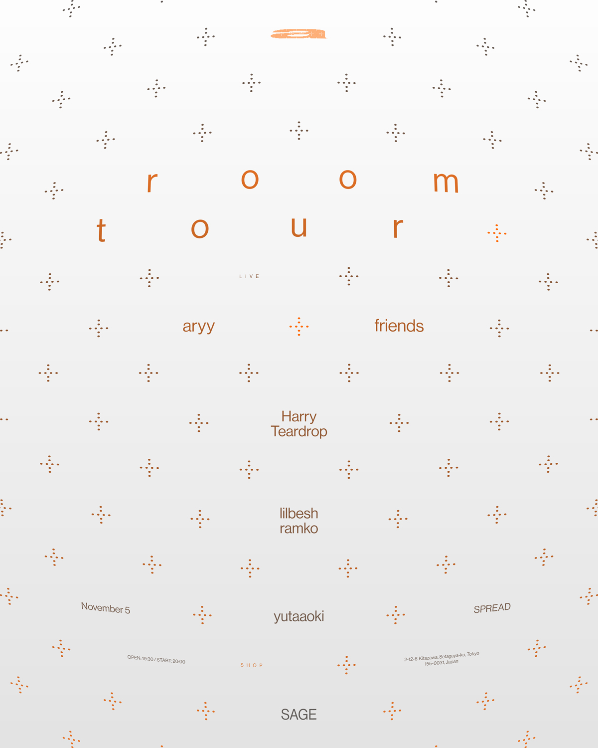 昨年の1stフル・アルバム『me and the world』に続く新作EP『M&TW+』を7月に発表したaryyが、同作ののリリース・パーティ「room tour+」を11月5日(火)に東京・下北沢 SPREADにて開催。当日に先駆けて公開されているフライヤー・アートは、デザイナー・Shotaro Shinozakiによるもの。