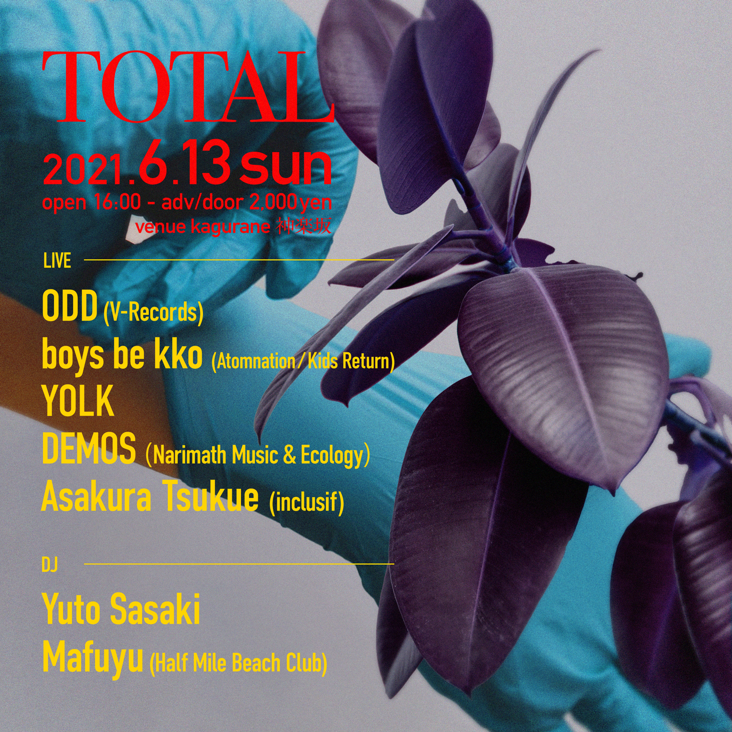 なおAsakuraは、6月13日(日)に自身が主催するイベント「TOTAL」を東京・神楽坂 kagurane / kgrnにて開催予定。同公演ではAsakuraに加え、ODD、boys be kko、YOLK、DEMOSがライヴ・パフォーマンス。YUTO SASAKIとMafuyu(Half mile Beach Club)がDJとして参加します。
