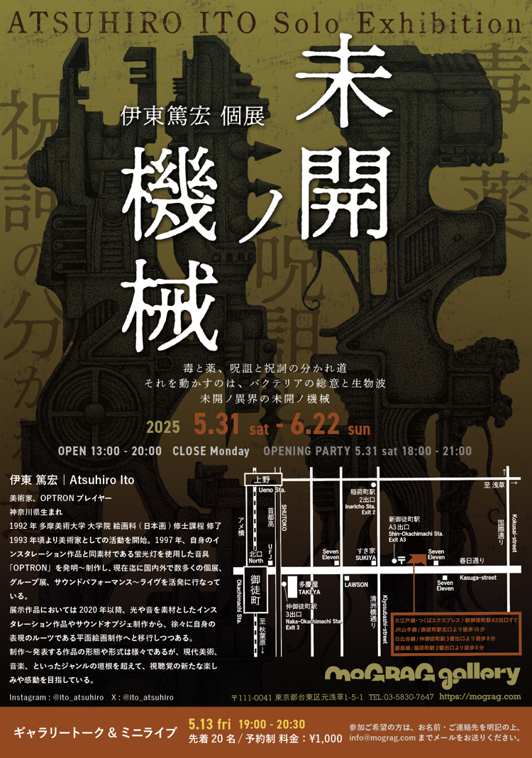 自作“音具”『オプトロン(OPTRON)』を用いる演奏家として、ソロやテンテンコと組んだZVIZMOなどで活躍する伊東篤宏が、画家 / 美術家としてのソロ・エキシビション「未開ノ機械」を5月31日(土)から6月22日(日)にかけて東京・新御徒町 mograg galleryにて開催。