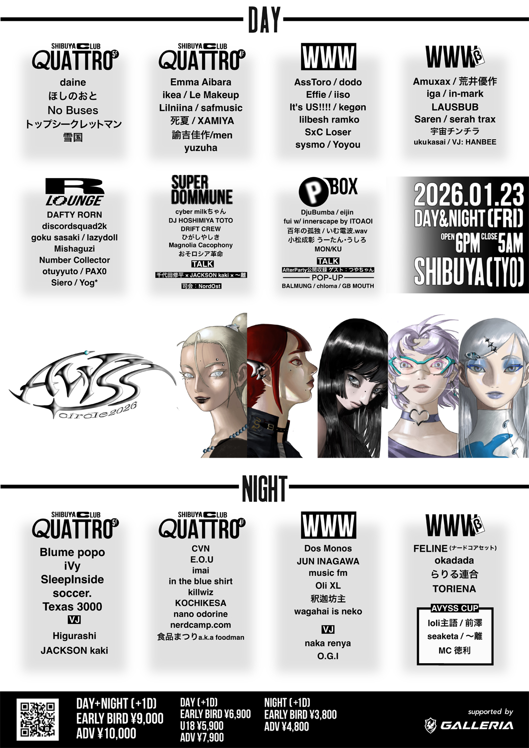 佐久間信行 aka CVN主宰の音楽プラットフォーム「AVYSS」が、2024年以来約2年ぶりとなる大規模サーキット・イベント「AVYSS Circle」を1月23日(金)に開催。東京・渋谷 CLUB QUATTRO 4-5F、WWW / WWWβ、R Lounge、SUPER DOMMUNE、PBOXの5会場 / 7フロアにてデイ・イベント / ナイト・イベントが行われます。