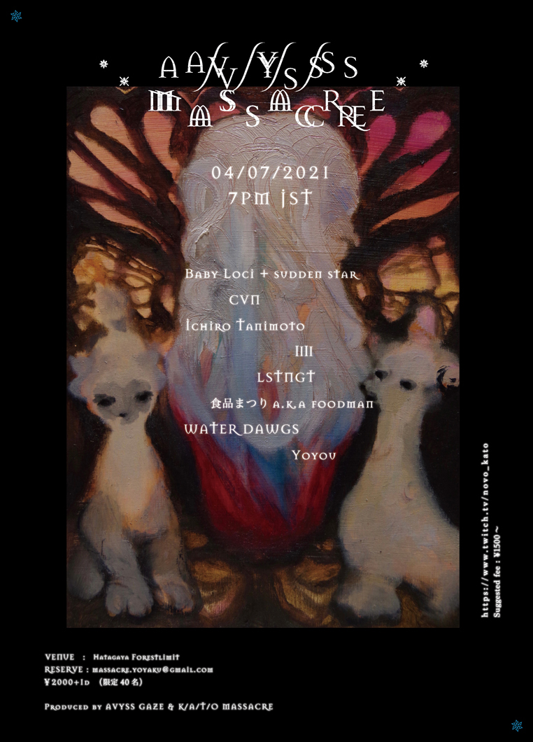 佐久間信行 aka CVN(AVYSS magazine)、stei(dosing | Dreaming of Screaming)、JACKSON kakiを中心に昨年発足し、ヴァーチャル・ワールドを舞台にしたオンライン・パーティを多数開催して注目を浴びる「AVYSS GAZE」と、ヴィンテージ・クロージング・ショップ「NOVO!」が主催する東京・幡ヶ谷 Forestlimitの看板パーティ「K/A/T/O MASSACRE」が、4月7日(水)にコラボレート・パーティ「A/V/Y/S/S MASSACRE」を開催。