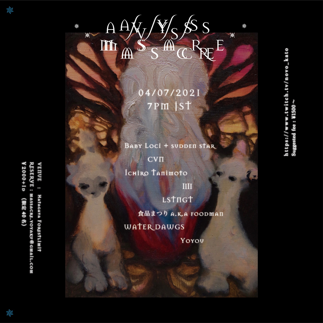 同公演は、3DCG化したヴァーチャルForestlimit(Twitch)および基底現実会場(定員40名)の双方で開催。ヴァーチャルでは、AR技術を投入したライヴ配信が予定されているとのこと。出演は、CVN、lIlI、LSTNGT、Yoyou(以上AVYSS GAZEキュレーション)、荒井優作、Baby Loci + sudden star、Ichiro Tanimoto、WATER DAWGS(以上K/A/T/O MASSACREキュレーション)の全8組。当初出演が予定されていた食品まつり a.k.a. foodmanは病欠となっています。