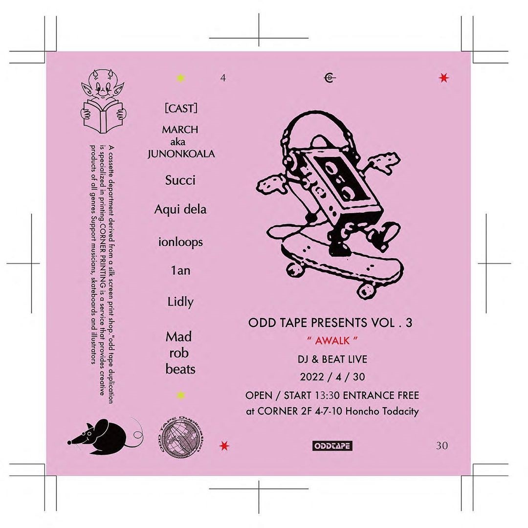 プリンティング・カンパニー「CORNER PRINTING」のカセットテープ制作部門 / レーベル / ショップ「ODD TAPE DUPLICATION」が、2月より埼玉・戸田公園 CORNER BOOKS(CORNER PRINTING SELF 戸田公園店2F)にてマンスリーで継続中の入場無料イベントを引き続き開催。第3回「AWALK」が4月30日(土)に同地にて開催されます。
