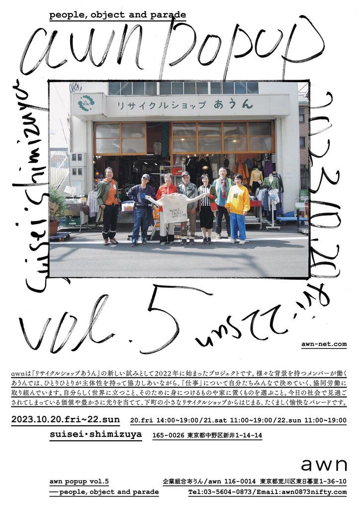 東京・三ノ輪にて「どっこい食堂あうん」「便利屋あうん」「リサイクルショップあうん」を運営する「企業組合あうん」がプロデュースする古着のセレクト・ブランド「awn」が、ポップアップ・ショップ「awn popup vol.5 -people, object and parade-」を東京・中野 suisei・shimizuya(旧・清水屋クリーニング)にて10月20日(金)から22日(日)まで開催。