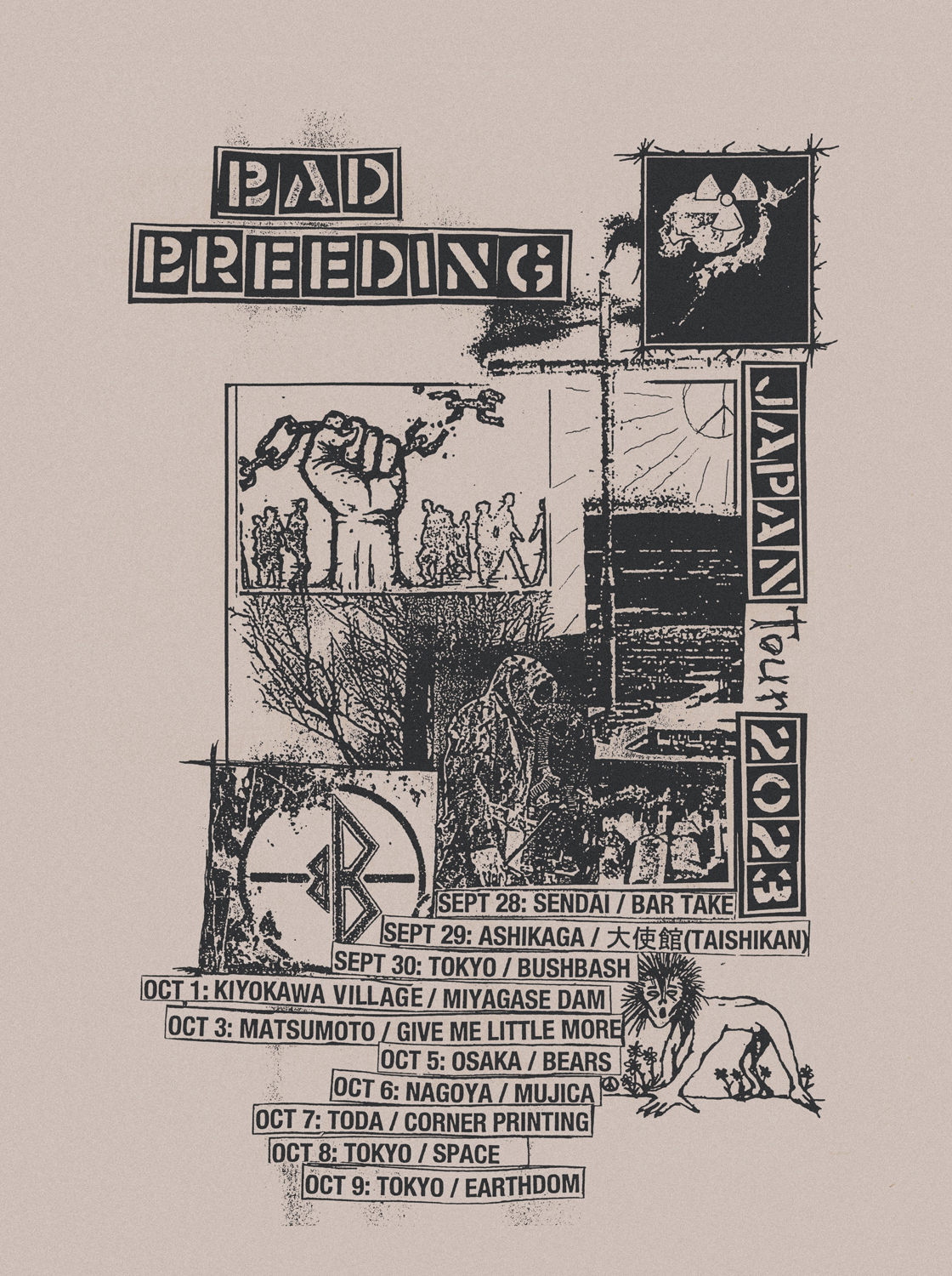 今年7月にBjörk作品でおなじみのDerek Birkett(FLUX OF PINK INDIANS, THE EPILEPTICS)主宰「One Little Independent Records」より発表した最新アルバム『Human Capital』では、Yagi(THE BREATH, SOCIO LA DIFEKTA, UNARM)や「La Vida Es Un Mus」のロゴで知られるDead City Tokyo / Deswadによるアートワークをフィーチャーし、収録曲「Prescription」のMVをWest Ward Audio Visual(Kohei Urakami | 鏡, RASHŌMON)が手掛けるなど、日本のパンク・シーンとの接点も多いBAD BREEDING。ツアーは9月28日(木)宮城・仙台 BARTAKE、29日(金)栃木・足利ライブハウス大使館、30日(土)東京・小岩 BUSHBASH、10月1日(日)神奈川・宮ヶ瀬湖畔園地 野外音楽堂(DEATHRO主催「BEATDAM2023」)、3日(火)長野・松本 Give me little more.、5日(木)大阪・難波 BEARS、6日(金)愛知・名古屋 MUJICA、7日(土)埼玉・戸田公園 CORNAR PRINTING(CORNAR PRINTING SELF 戸田公園店 2F)、8日(日)東京・新宿 SPACE、9日(祝・月)東京・新大久保 EARTHDOMの全10公演。各地で個性的な面々との共演が予定されています。