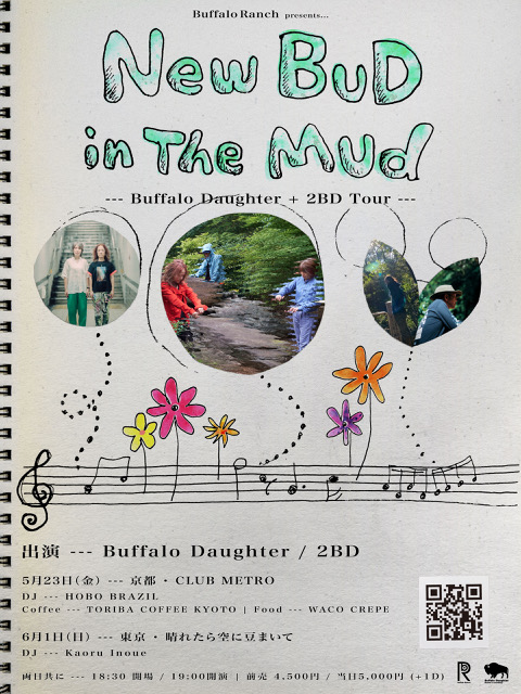 同ツアーは、Buffalo Daughterのメンバー・大野由美子とシュガー吉永によるデュオ・2BDがBuffalo Daughterのレーベル「Buffalo Ranch」から5月に1st EP『New BuD In The Mud』をリリースすることを記念して開催されるもの。Buffalo Daughter、2BDに加え、京都公演ではDJにHOBO BRAZILを迎え、バンドと親交のある「TORIBA COFFEE KYOTO」と「WACO CREPEが」がフード出店。東京公演には、DJとしてKaoru Inoueが出演します。チケットは、京都公演のみ枚数限定で早割チケットを3月26日(水)20:00から28(金)21:59まで販売(限定枚数に達し次第受付終了)。一般販売はいずれの公演も3月28日(金)22:00より開始されます。