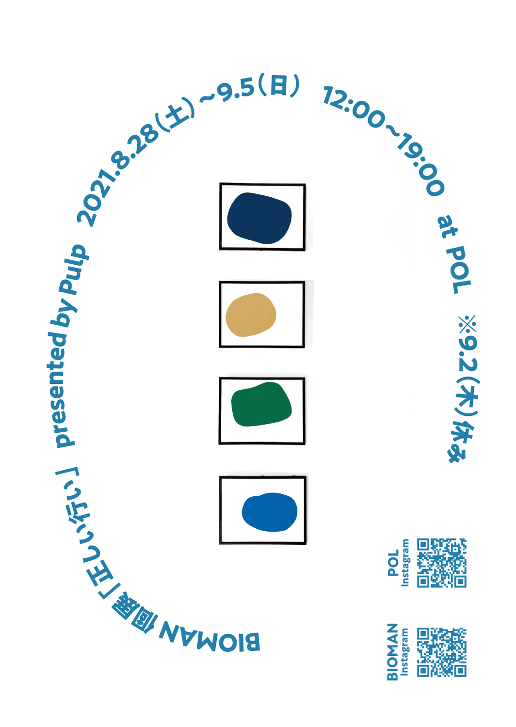 パク・ダハム主宰「Helicopter Record」とプリント・スタジオ「BEM」のコラボレートTシャツへのデザイン提供や、「CHANEL」2021-2022年A/Wオートクチュール・コレクションのランウェイ・ミュージックに使用された岩本清顕によるJOY DIVISION日本語カヴァーのリワーク「Love Will Tear Us Apart (千紗子と純太 Rework)」などが話題となっている音楽家 / グラフィック・デザイナーBIOMANが、ソロ・エキシビション「正しい行い」を8月28日(土)から9月5日(日)まで大阪・谷町 POLにて開催。