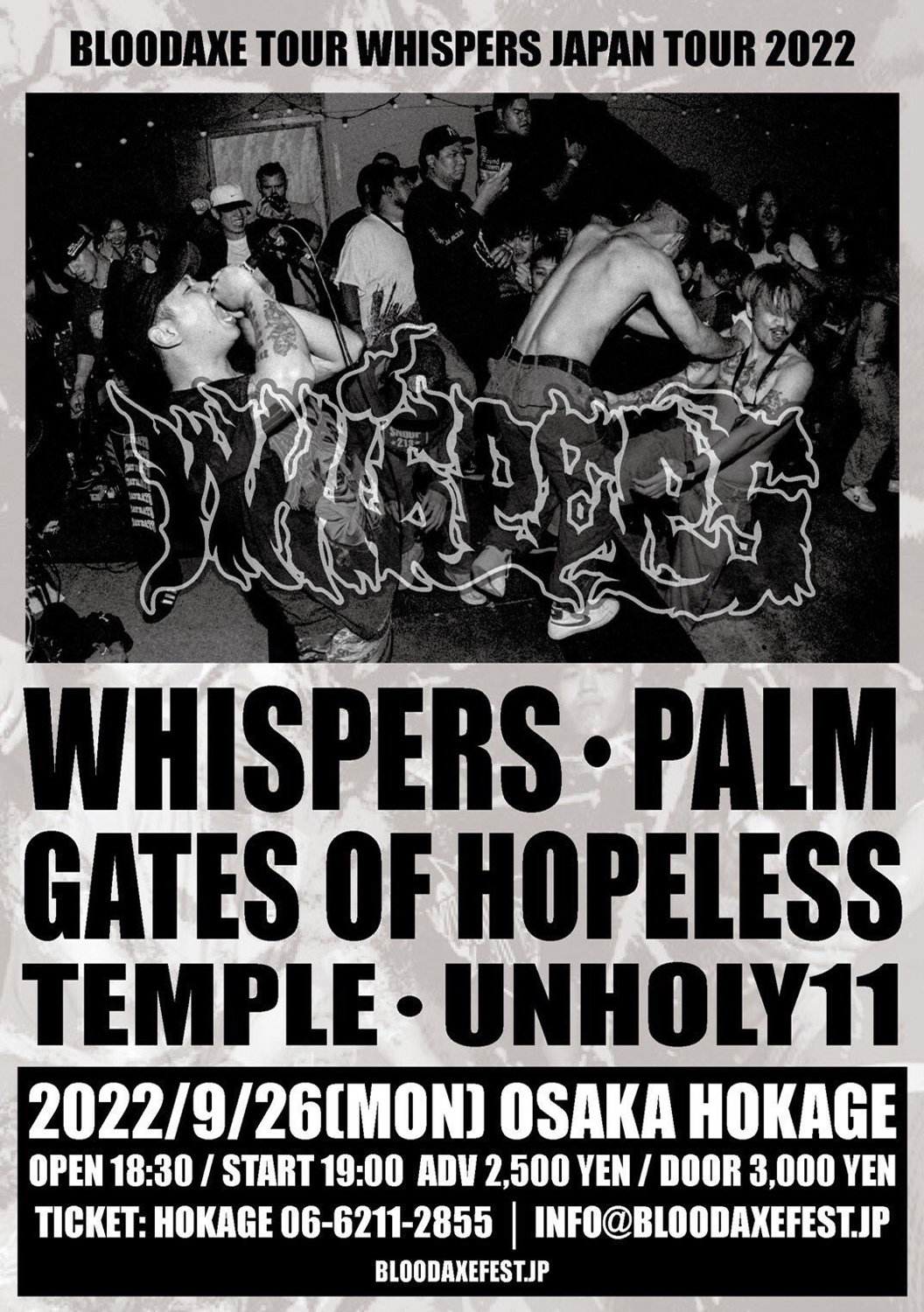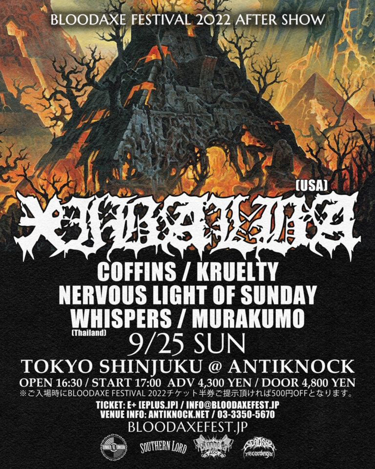 「BLOODAXE FESTIVAL 2022」翌日の9月25日(日)に東京・新宿 ANTIKNOCKにて開催される「BLOODAXE FESTIVAL 2022 AFTER SHOW」には、WHISPERS、XIBALBA両バンドに加えて縁深いCOFFINS、KRUELTYやMurakuMo、nervous light of sundayが出演。その後WHISPERSは大阪へと移動し、9月26日(月)に大阪・西心斎橋 Music Bar HOKAGEで開催される「BLOODAXE TOUR "WHISPERS JAPAN TOUR 2022"」にてGATES OF HOPELESS、PALM、TEMPLE、UNHOLY11との共演が決定しています。