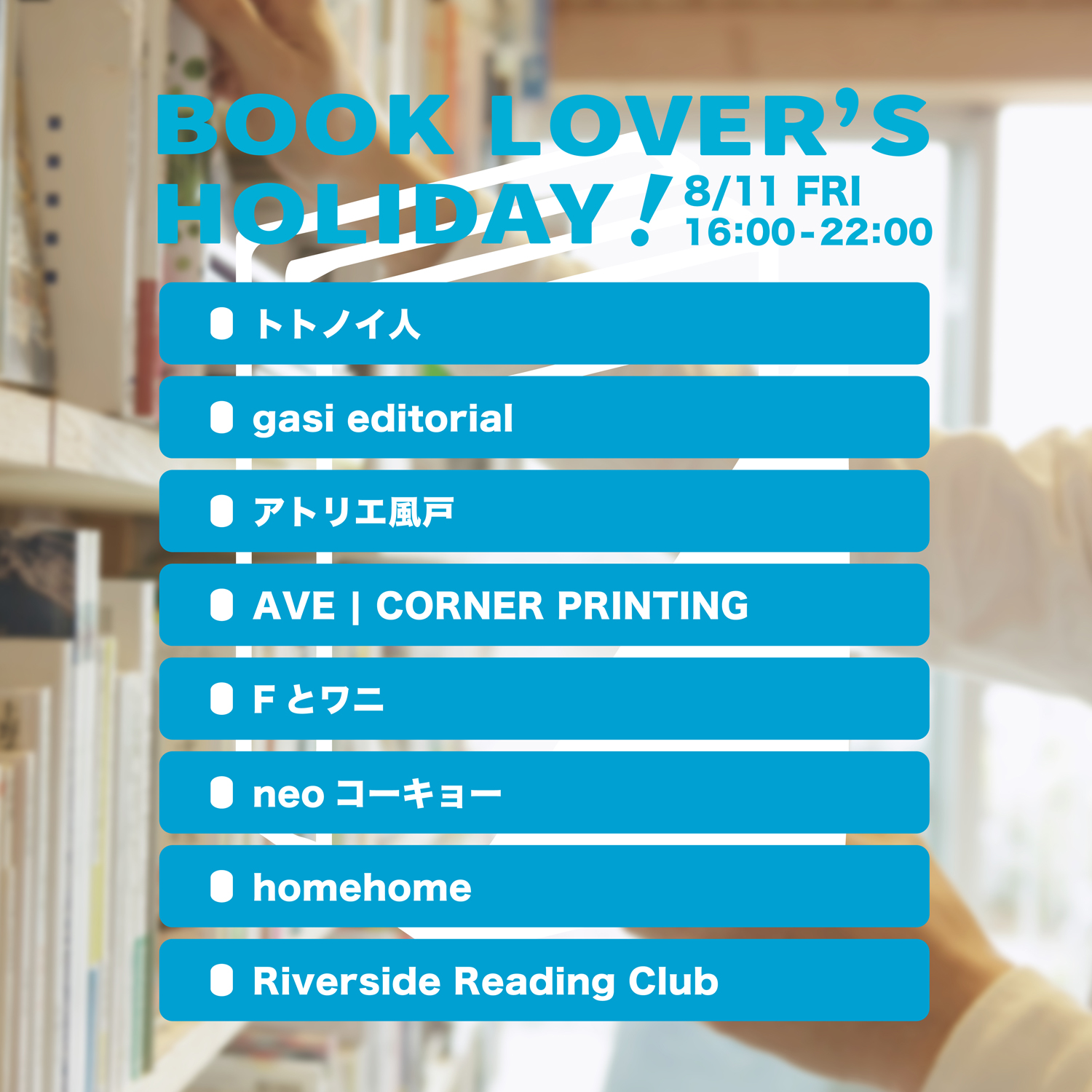 トトノイ人 / gasi editorial / アトリエ風戸 / AVE | CORNER PRINTING / Fとワニ / neoコーキョー / homehome / Riverside Reading Club