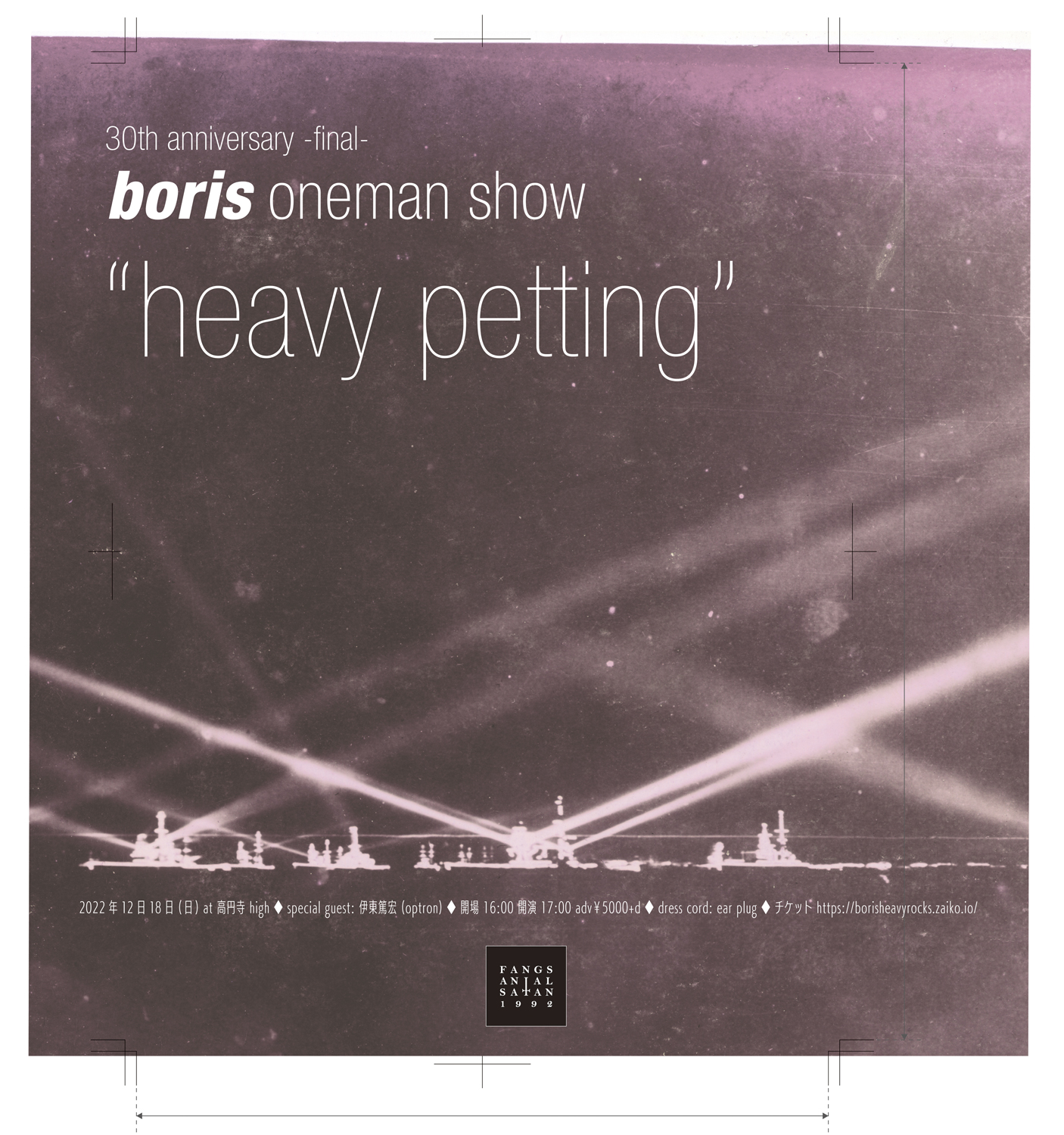 なおBorisは、アニヴァーサリー・イヤーのフィナーレとなる小文字“boris”フォームでのワンマン・ライヴ「heavy petting」を12月18日(日)に東京・高円寺 HIGHにて開催。同公演はウルトラ・ヘヴィ + マキシマム・ヴォリュームがゆえ、冗談抜きにイヤープラグがドレスコード。蛍光灯の放電ノイズを利用した自作発光音響器具・オプトロン(OPTRON)の奏者として名高い美術家・伊東篤宏のスペシャル・ゲスト出演も予定されています。