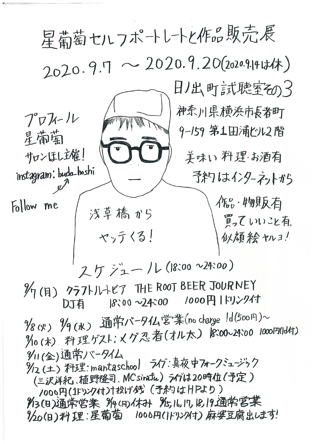 東京・浅草橋のメディア・サロン「サロンほし」(旧・浅草橋天才算数塾)を主宰し、2018年刊行の『おかお みせて』(福音館書店)が好評の絵本作家としても活動する美術家 / オーガナイザー・星 葡萄(fka DJぷりぷり~セクシーキラー)が、ソロ・エキシビション「星葡萄セルフポートレートと作品販売展」を9月7日(月)から20日(日)にかけて神奈川・横浜 日ノ出町 試聴室その3にて開催。