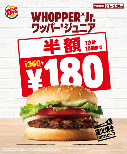 バーガーキング®(株式会社ビーケージャパンホールディングス)が、『ワッパー® ジュニア』を通常価格360円の半額180円で販売するキャンペーンを2月7日(金)から2月20日(木)までの2週間限定で実施。