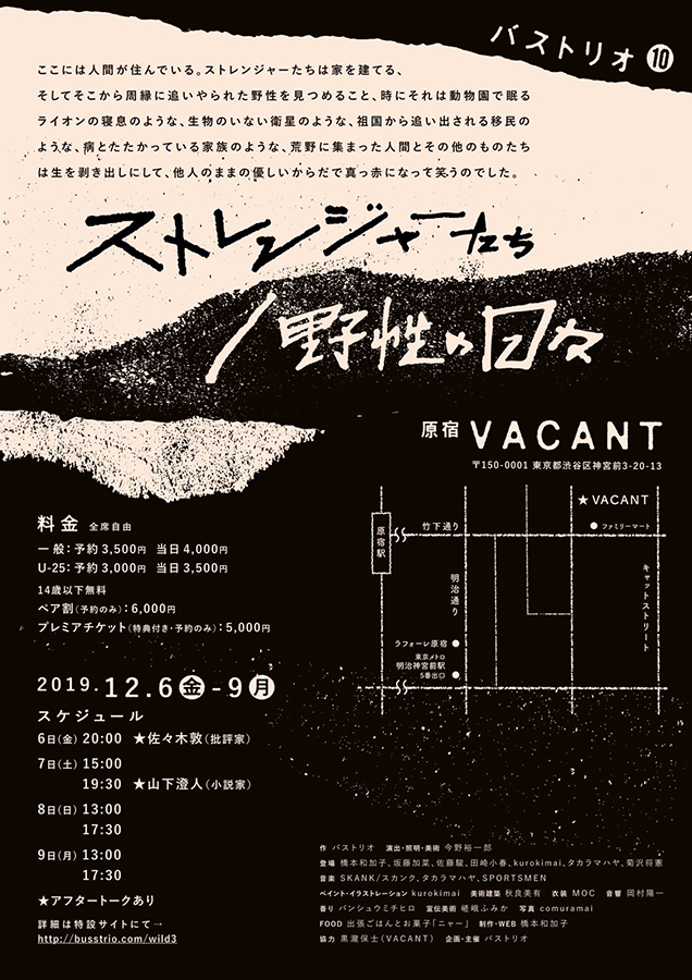 2017年の『エモーショナル』以来2年ぶりの本公演となる同作は、『ストレンジャーたち』と『野性の日々』のエクスパンデッド・エディション。両作の参加者に加え、音楽でSKANK / スカンクとタカラマハヤ、俳優として菊沢将憲、田崎小春の参加も新たに決定しています。なお会場には、“出張ご飯とお菓子”「ニャー」のフード出店も予定。6日(金)は批評家・佐々木 敦、7日(土)は小説家・山下澄人を迎えてのアフター・トークも開催されます。