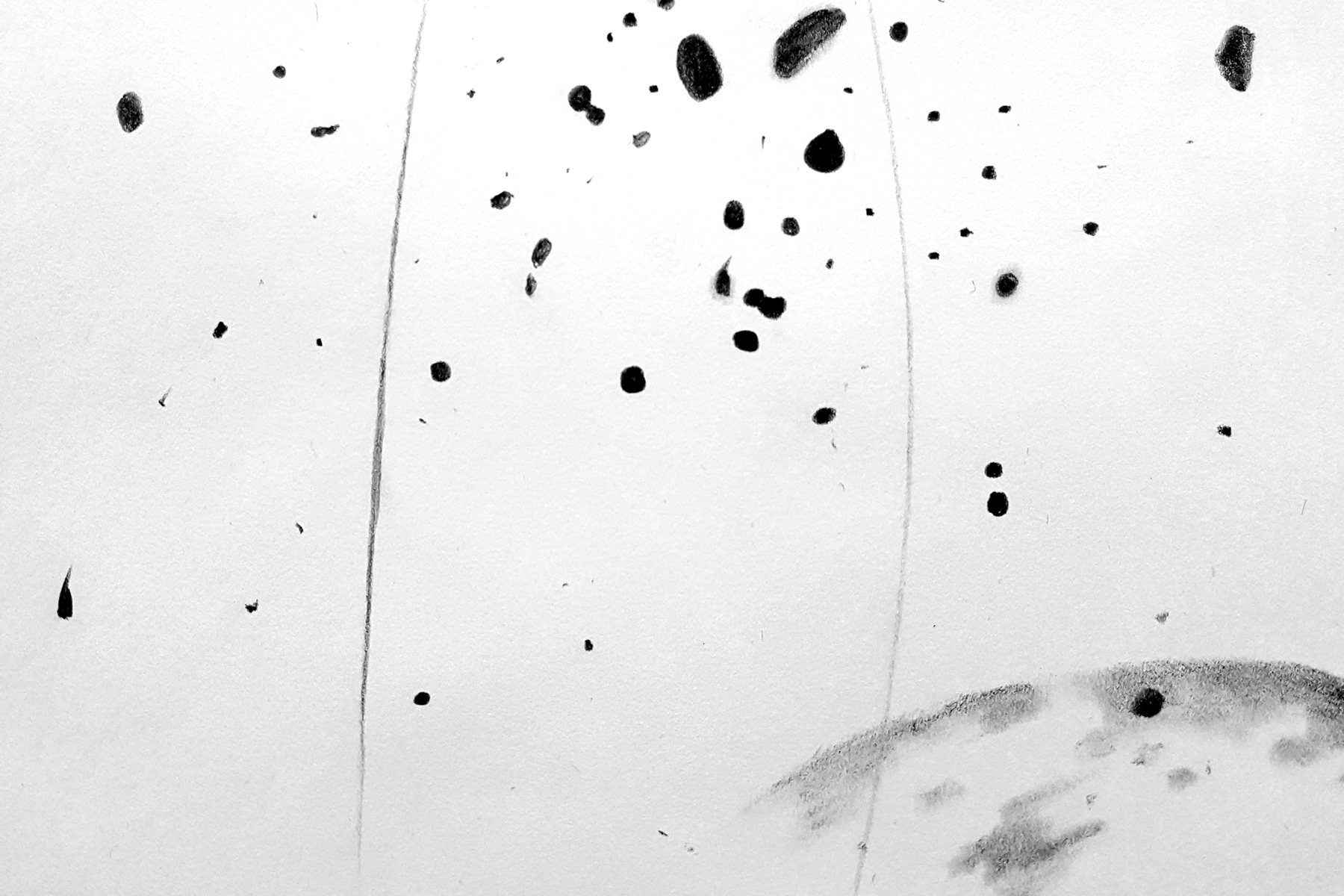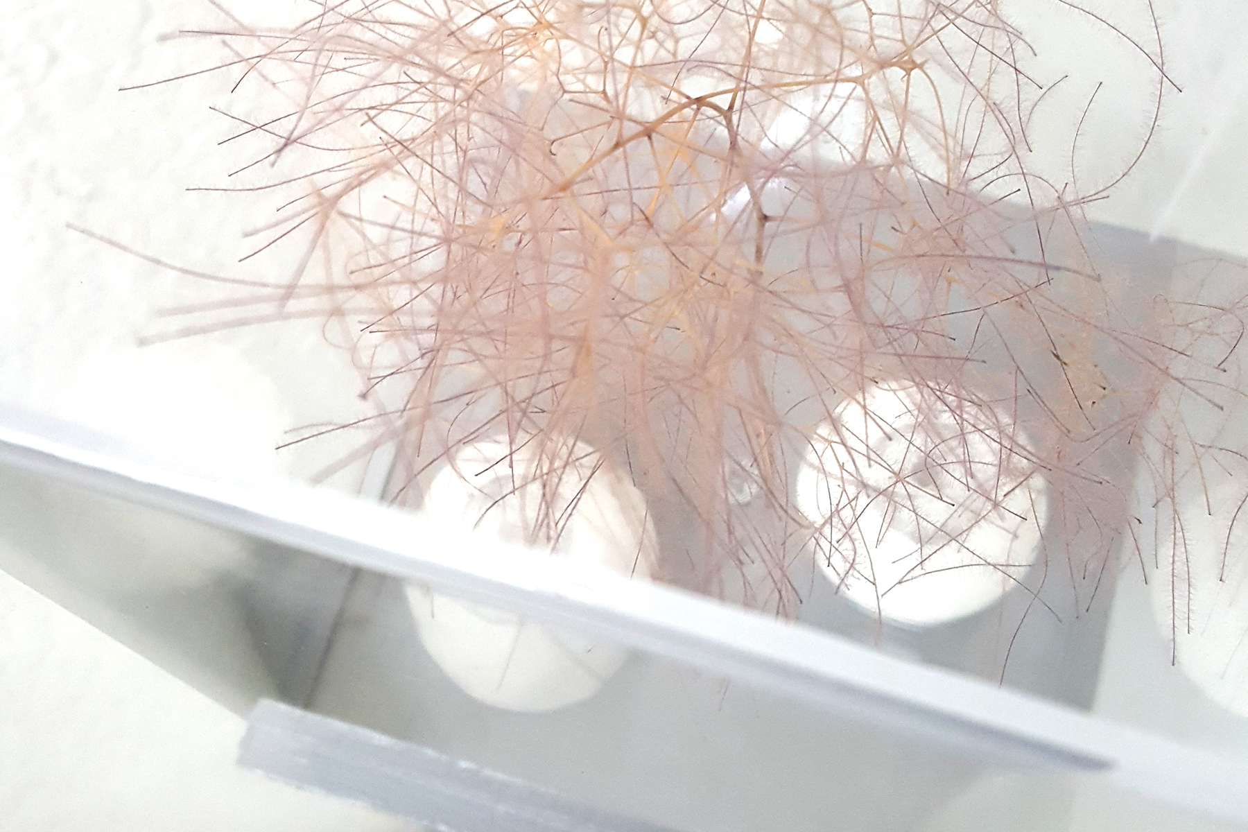 近藤さくらさんの絵は、何だかよくわからない。岩のように堅くも見えるし、コロイドのように軟らかくも見える。高速で移動する持続のようにも見えるし、違う時間軸で静止する瞬間のようにも見える。轟音が聞こえてくるようでもあるし、耳が痛くなるような静寂に吸収されるようでもある。直線的な意味では、そもそも何が描かれているのかがわからない。ご本人とお話してみると、どうも作家自身ですらわからないらしい。何のヴィジョンもなく描き始め、筆が進み、何かが立ち上がってくるにつれて「なるほど」と感じるそうです。「なるほど」って。まるで他人行儀で、自分では描いていないような言い草だけれど、絵の技術に疎い筆者だって、これだけ大きな絵を完成させるまでに費やされた労力がどれだけのものか、ある程度は想像できる。白波多カミンさんのフライヤー・アートにあしらわれた写実的な美しさを伴うピースを見れば、技術を磨く時間を重ねてきたであろうことだってわかる。少なくとも自分なら、“何か”を描く確固たる“何か”がなければ、わざわざ臨まないであろう行為です。言葉では曖昧な対象および主体である“何か”と“確固たる”は矛盾するように思えるけれど、それは対象と主体が明瞭である様を“確固たる”としているだけであって、過程や行為そのもの、もっと言えばガッシュや筆といった道具、もしくは近藤さんの手などを、“何か”が明瞭化するということだってあるんじゃないでしょうか。だから、こういう言いかたは本来、作家さんに失礼だろうけど、近藤さんは対象たる“何か”に固定された“道具”なのかもしれないって思う。近藤さんが不定期に刊行している「視線の標本」という小さな冊子のタイトルが好きなのだけれど、それも誌面に綴られているような日常を近藤さんが固定しているのではなく、日常に固定された近藤さんの標本なのだという気がしています。移動中に発見した“何か”の数々を携帯電話で撮影し、CARREと白波多カミンさんよる音楽と共に編集した映像作品『眼差しの蓄積』を本展で初めて拝見して、その思いをさらに強くしました。近藤さんは同作のために、“何か”を見つけるや否や、不動の姿勢で撮影を繰り返したそうで、字義通り固定されていたというのは思い切り余談ですが(笑)。標本はたぶん、ドモチェフスキーの“何かの部品”といっしょで、あるときに浮かび上がった定着しない何かを、繋ぎとめる(ストランディング)ためにあるのです。それはもしかしたら、意図や背景を求める“アート”ではないのかもしれませんが、筆者を含む複数の観測者が近藤さんの作品に固定させられているのかと思うと、愉快で、ほっとしたような気持ちになります。世界は、ある種受動的に固定された非連続のレイヤーで成り立っているけれど、どのような力を行使して、どう繋ぎとめるかによって、大きく変化するということを、改めて思い知らされるのです。「Cale / Field Sewing Tokyo」の入口付近にひっそり展示されていた神経系を思わせる立体作品のキョトンとした目も、そう言いたげに見えました。