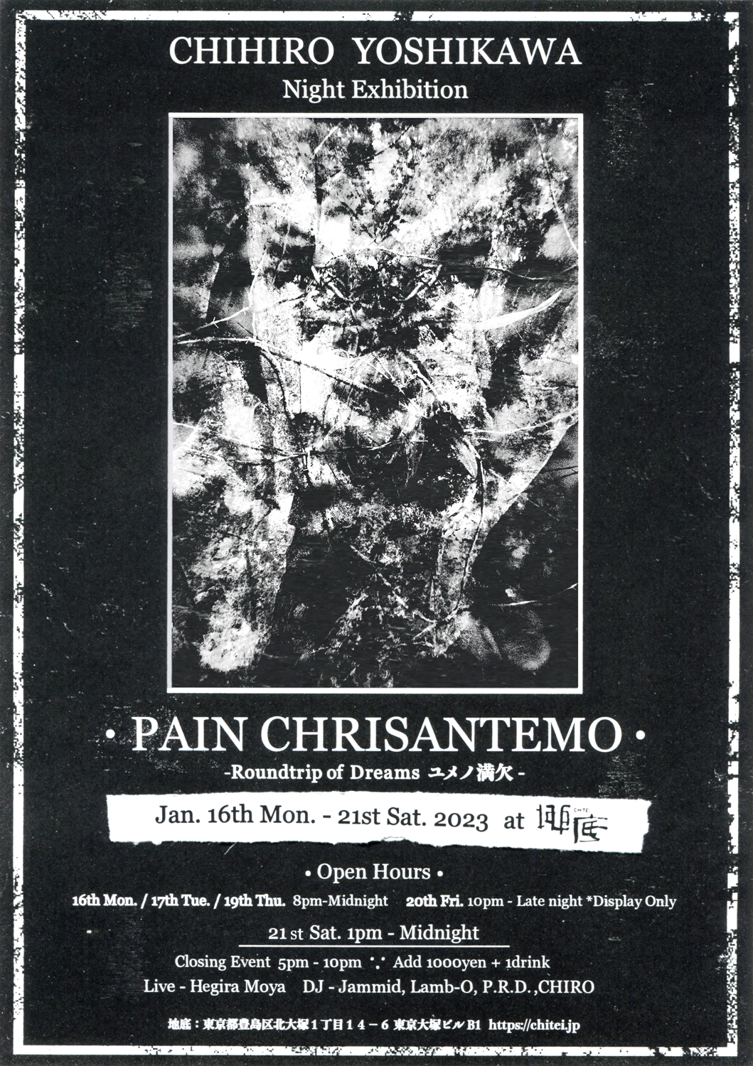 国内外パンク・バンドのライヴ・フォトやポートレイトの撮影で広く知られ、昨年は東京・下馬 INHERIT GALLERYにて開催されたDMB PRODUCTION主催「Days of Mello Black」や、東京・原宿 UltraSuperNew Galleryでのグループ・エキシビション「Damaged Goods」への出展が好評を博した写真家・吉河千尋が、1月16日(月)から21日(土)にかけて個展「PAIN CHRISANTEMO -Roundtrip of Dreams ユメノ満欠-」を東京・大塚 地底にて開催。