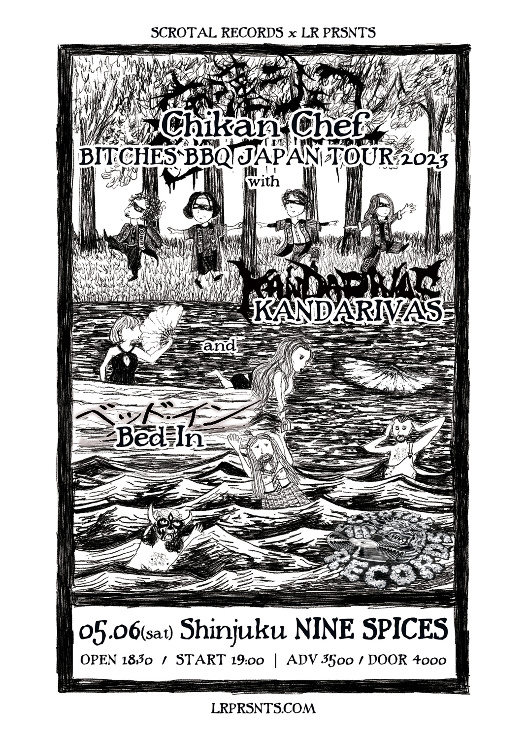 メンバー・キモい課長(g, b, vo)がかつて大阪ブルータル・ハードコア代表・PALMにてサポート・ベーシストを務めていたことでも知られるCHIKAN CHEF。ツアーは4月27日(木)香川・高松 TOONICE、28日(金)岡山・PEPPERLAND、29日(土)福岡・天神 public space 四次元、5月5日(金)東京・中野 MOONSTEP、6日(土)東京・新宿 NINE SPICES、7日(日)神奈川・西横浜 EL PUENTE、12日(金)大阪・西心斎橋 HOKAGE、13日(土)京都・Pop! Pizzaの全8公演。ライヴ・イベント・シリーズ「RESET/REBUILD」を主催するLRとの共同開催となる5月6日の(土)東京・新宿 NINE SPICES公演では、今年で活動10周年の“サラダ記念イヤー”を迎えたベッド・イン、昨年SWARRRMとのスプリット作品『Layered Chimera』(Daymare Recordings)を発表して話題となったKANDARIVASとの3マンが予定されています。