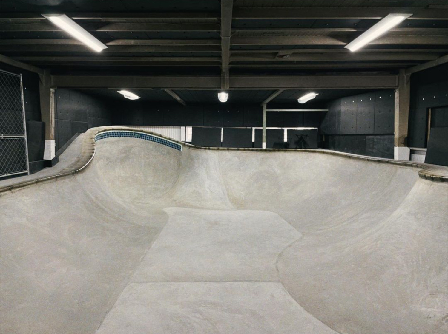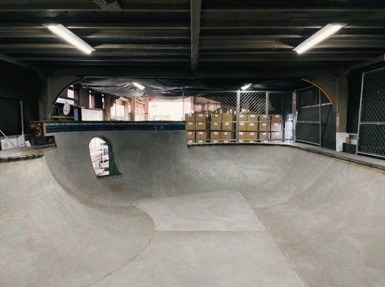 倉庫内に設置されたオール・プールコーピングのコンクリート・ボウル「CLANK BOWL」は、過去にも多くのパークを手がけてきた「BYC」「Mosaic Tile Works」の協力を仰ぎ、手作業で施工されたもの。