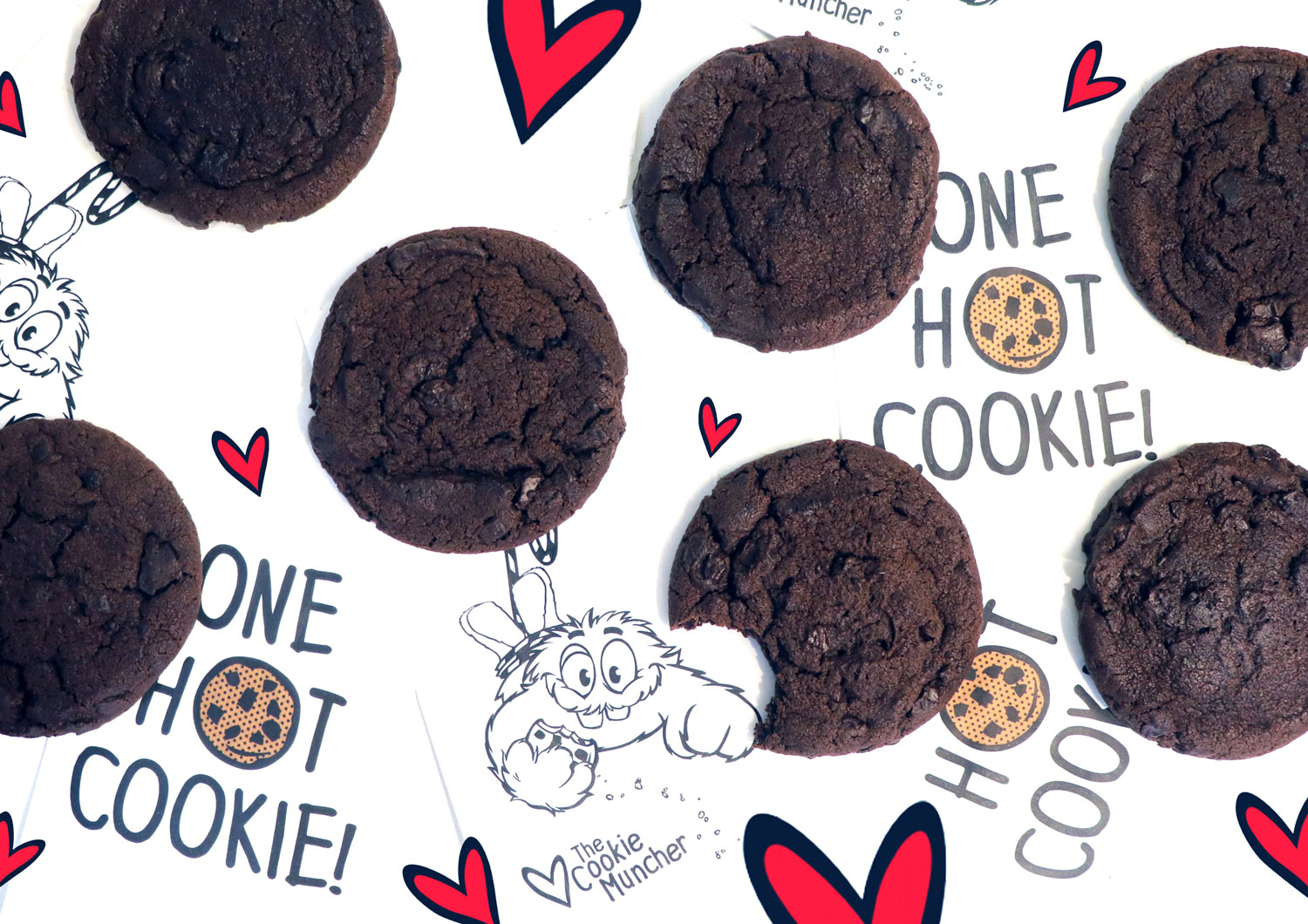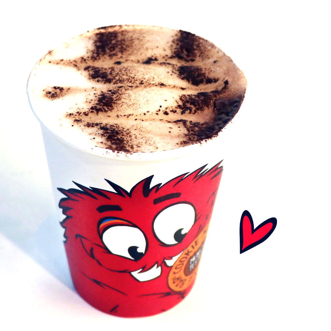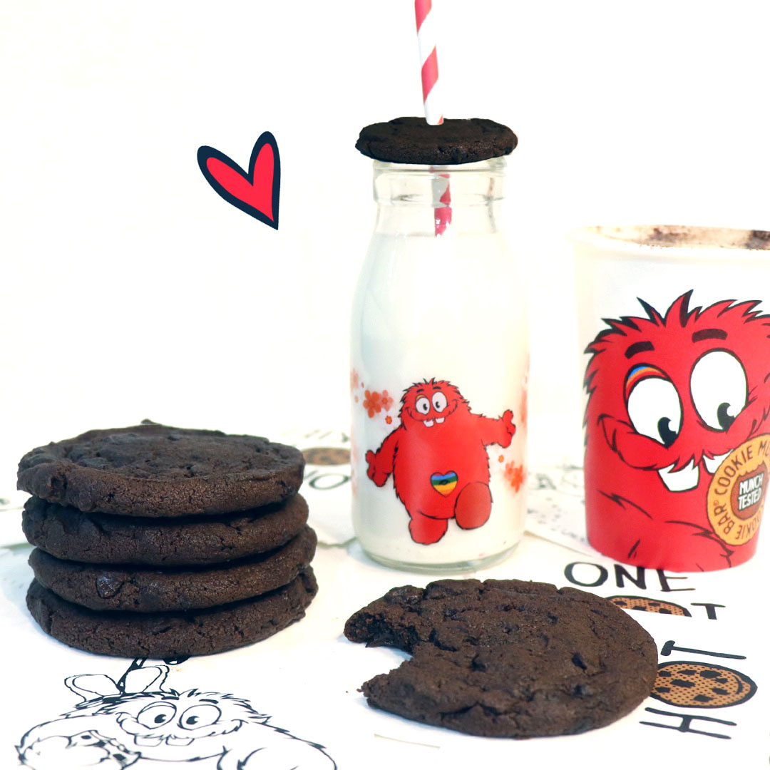 販売が開始されたのは、通常のクッキーの基本原材料であるバターや卵は使用せず、カカオの薫りディープな乳製品不使用チョコレートをミックスした、しっとり生地の『ヴィーガン ダブルチョコレートクッキー』(340円 + 税)。アーモンドミルクを使用したホットチョコレート『ヴィーガン ホットチョコレート』(550円 + 税)と、牛乳瓶入りのアーモンドミルクにヴィーガン ダブルチョコレートクッキーの蓋を添えた『ヴィーガン ミルクボトル』(800円 + 税)も同時発売です。なお、同店のキャラクター“クッキーマンチャー”のイラストをあしらったヴィーガン ミルクボトルの牛乳瓶は、持ち帰り可能。