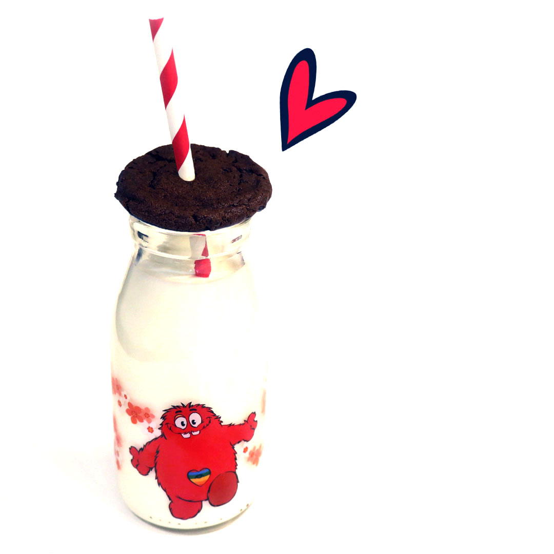 クッキーマンチャーが描かれている可愛らしい牛乳瓶に注がれる、ライトな味わいのアーモンドミルクの蓋には、焼きたてのヴィーガン クッキーを。ミルクのおかわりは無料です。瓶はお持ち帰りいただけます。