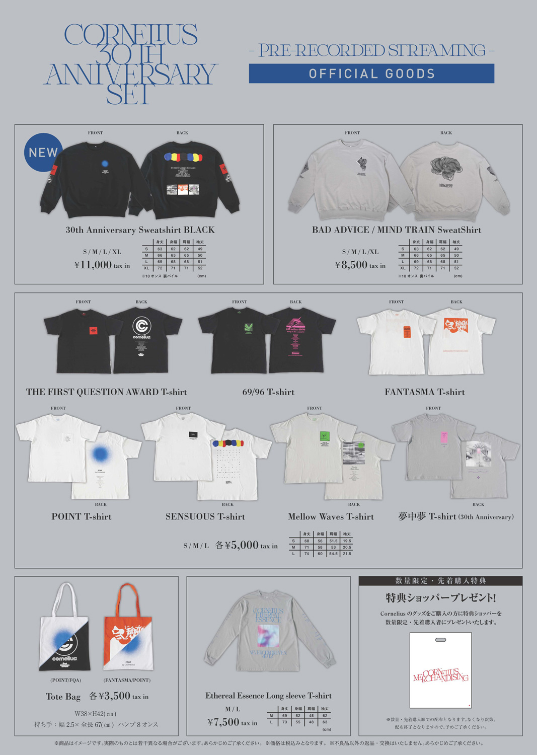 なおCorneliusは、30周年記念ライヴの映像『Cornelius 30th Anniversary Set (Pre-recorded streaming)』を12月24日(火)19:00から2025年1月7日(火)23:59まで有料配信。これを記念して、ライヴ開場で販売された「30th Anniversary Sweatshirt」のアナザー・カラー・エディションが12月24日(火)19:00よりワーナーミュージック・ストアにて販売されます。