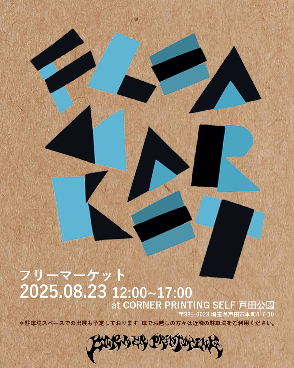 各種アパレルや雑貨へのプリント / 刺繍から、縫製や編み機による成形、アクリルの加工まで、全方位でDIYをサポートするプリンティング・カンパニー「CORNER PRINTING」が、2023年以来約2年ぶりとなるフリーマーケット・イベントを埼玉・戸田公園の同社セルフ・プリント・スタジオ「CORNER PRINTING SELF 戸田公園店」にて8月23日(土)に開催。