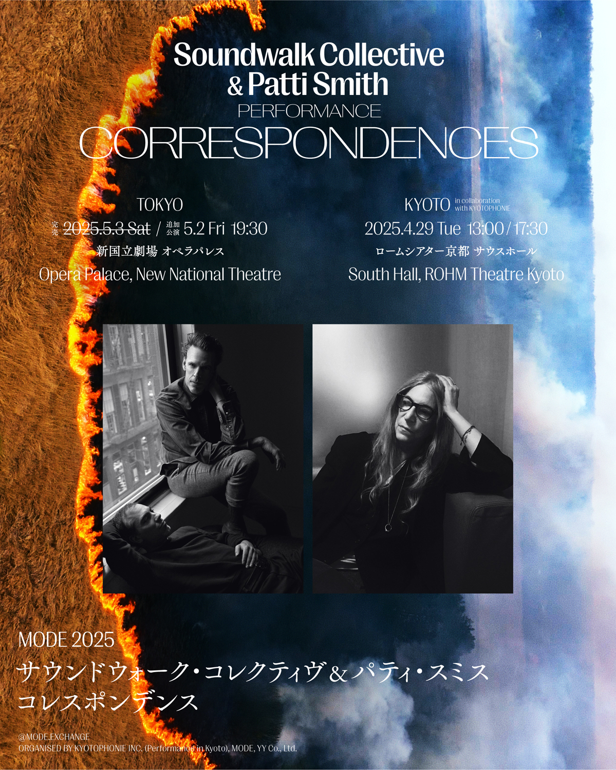 エキシビション「MOT Plus サウンドウォーク・コレクティヴ & パティ・スミス | コレスポンデンス」を東京・清澄白河 東京都現代美術館にて4月26日(土)から6月29日(日)まで開催する音楽家 / 詩人/ 画家 / パフォーマー・Patti Smithと現代音響芸術集団「Soundwalk Collective」の協働プロジェクト「CORRESPONDENCES」が、ライヴ・パフォーマンスの追加公演を5月2日(金)に東京・初台 新国立劇場 オペラパレス「MODE 2025」内にて上演。5月3日(土)に同じく「MODE 2025」内で行われる公演は予定枚数の販売が終了。4月29日(火・祝)の京都・ロームシアター京都 サウスホールでの昼夜2公演「KYOTOPHONIE in collaboration with MODE」もチケットは残り僅かとなっています。