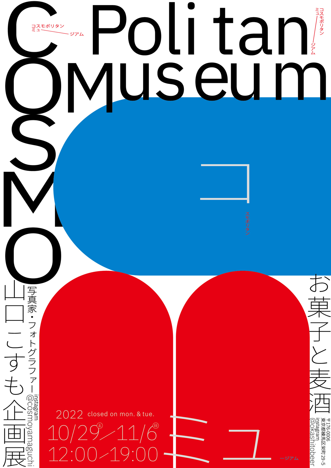 NRQ『こもん』、NONA REEVES『Discography』のカヴァー・フォトなどを手がける写真家・山口こすもが、企画展「cosmopolitan museum」を10月29日(土)から11月6日(日)まで東京・江古田 お菓子と麦酒にて開催。フライヤー・デザインは山口晋似郎によるもの。