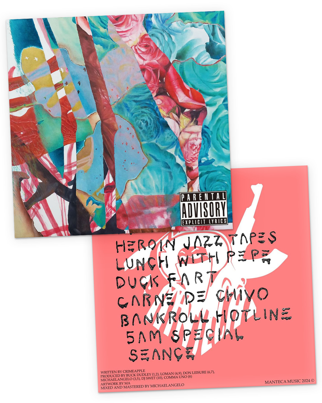 『LETHIMCOOK』のカヴァーにフィーチャーされているのは、MAが2017年に制作した1,000mm四方のキャンバス作品『Yesterday's Medicine』。アルバムのテーマである“サイケデリック”に合致する作品としてCRIMEAPPLE自身が選出しています。バック・カヴァーにあしらわれた各楽曲タイトルのレタリングも、MAが“Dripping Letters”で描き下ろしたもの。