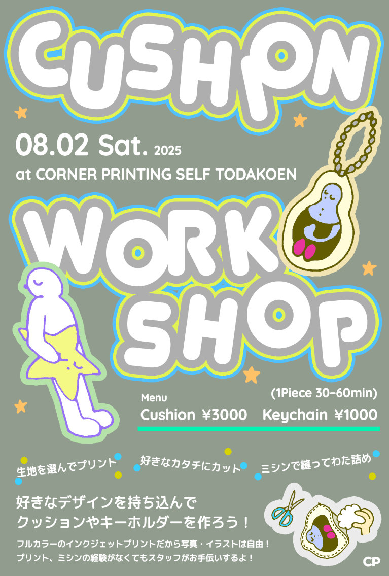 Tシャツをはじめとするアパレルへのプリントのみならず、様々な手法を用いてクリエイターの願望を具現化するDIYサポート / プリンティング・カンパニー「CORNER PRINTING」。そのインクジェット・プリント / 縫製ディヴィジョンが、オリジナルのクッション / クッションキーホルダーが制作できるワークショップを埼玉・戸田公園に構える自社のセルフ・プリント・スタジオ「CORNER PRINTING SELF 戸田公園店」にて8月2日(土)に開催。