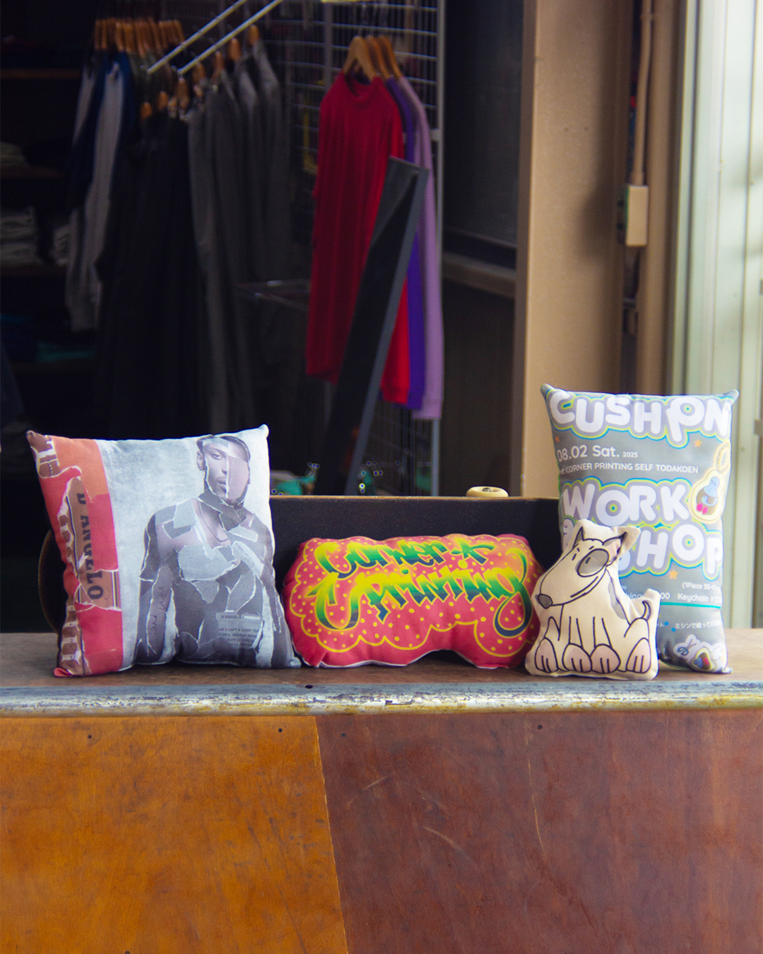 同企画では、「CORNER PRINTING」ECサイトからの受注で好評を博しながらも、現在は販売停止となっているクッション / クッションキーホルダーが1日限りのカムバック。参加者が持参した画像データをインクジェット・プリンターでファブリックに印刷し、お好みのシェイプに裁断。その場で縫製 / わた詰めすることで、約30分〜1時間の工程でオリジナルのクッション or クッションキーホルダーが完成します。受付時間内であればいつでも訪店可能。専属スタッフのサポートにより、未経験者でも安心して参加できます。